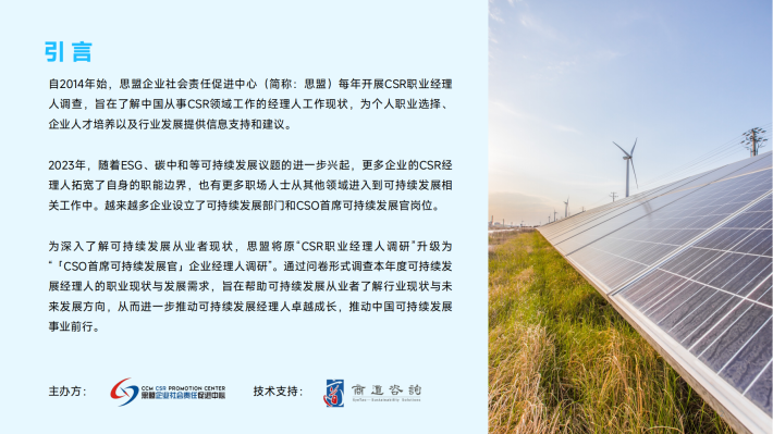 为深入了解可持续发展从业者现状,思盟将原“CSR职业经理人调研”升级为“「CSO首席可持续发展官」企业经理人调研”。通过问卷形式调查本年度可持续发展经理人的职业现状与发展需求,旨在帮助可持续发展从业者了解行业现状与未来发展方向,从而进一步推动可持续发展经理人卓越成长,推动中国可持续发展事业前行。