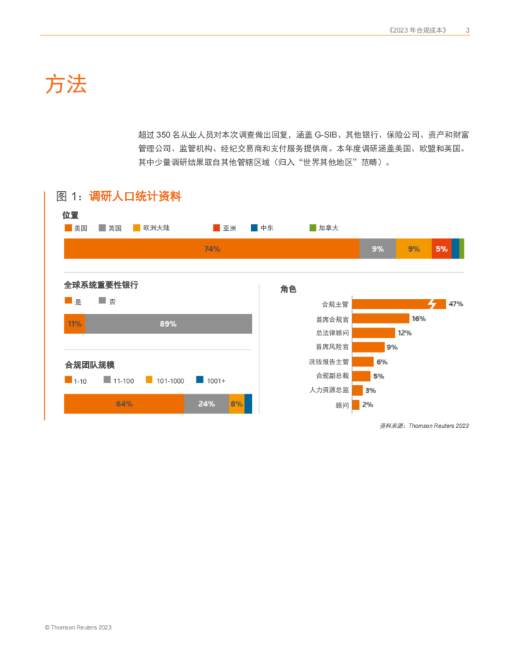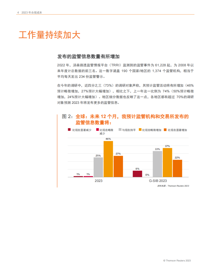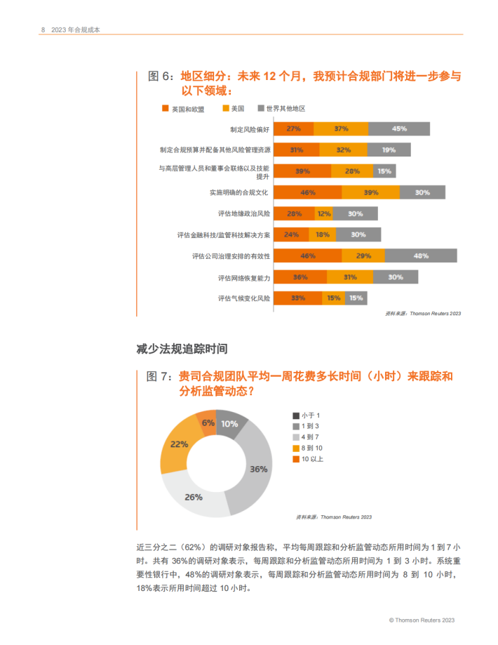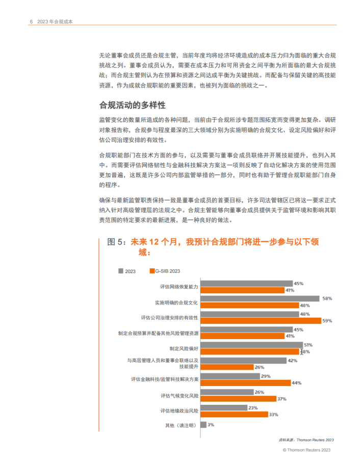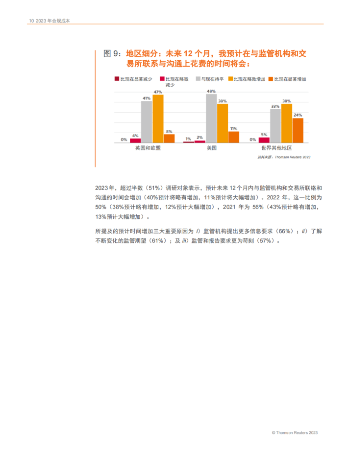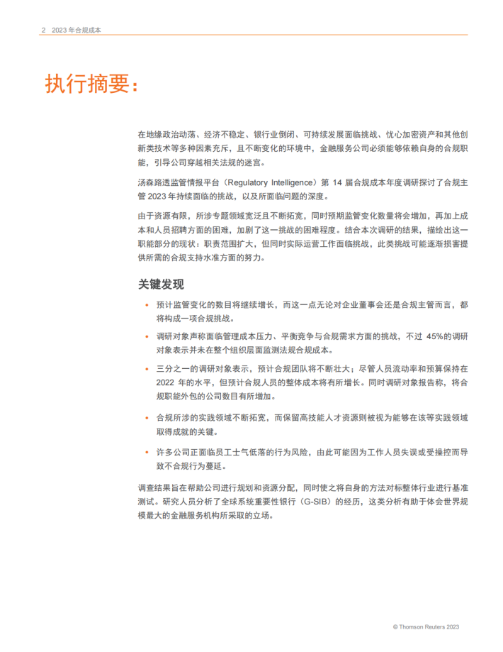 三分之一的调研对象表示,预计合规团队将不断壮大;尽管人员流动率和预算保持在2022年的水平,但预计合规人员的整体成本将有所增长。同时调研对象报告称,将合规职能外包的公司数目有所增加。