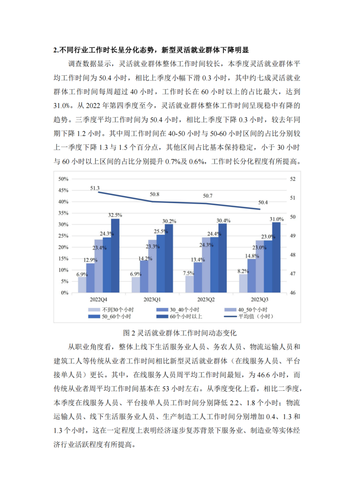 从工作时间角度看,灵活就业群体三季度平均工作时间为50.4小时,相比