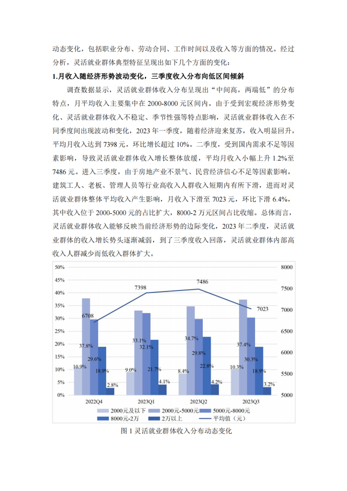 从收入角度看,灵活就业群体月收入分布总体保持稳定,月收入主要集中在2000-8000元之间。2023年以来,其月平均收入随经济修复而呈现回升态势,进入三季度平均收入下滑至7023元,环比下滑6.2%,收入分布方面短期内高收入人群占比降低,低收入人群占比有所抬升。