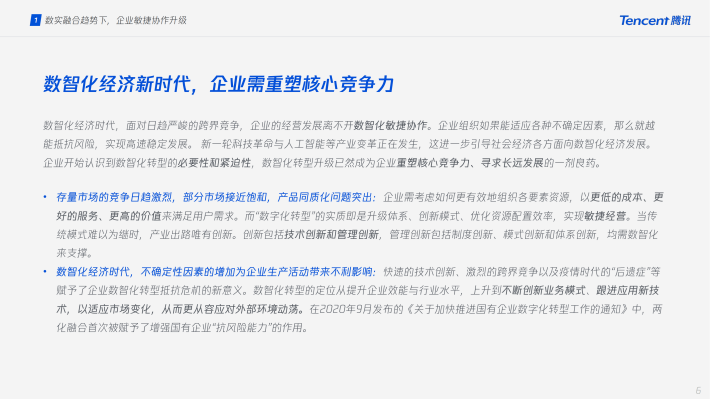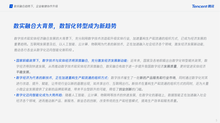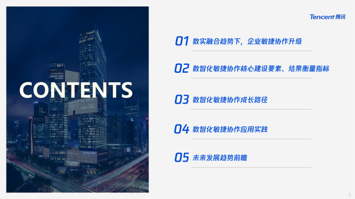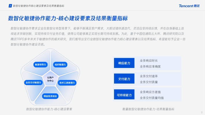 为此,腾讯TAPD平台中心联合腾讯研究院、中国信通院云大所共同撰写《2023年企业数智化敏捷协作数据报告》。与往年报告不同,本数据报告将全面阐述数智化敏捷行业的发展,同时我们总结出数智化敏捷协作能力核心建设要素,以及数智化敏捷协作能力的衡量结果指标,希望帮助企业更好地理解数智化敏捷协作,评估当前组织在数智化敏捷协作过程中具备的能力水平和自身现实状况,为企业进行下一步数智化敏捷协作发展转型和战略方向的选择提供指导性意见。此外,该报告从区域、场景与规模三个维度对敏捷协作进行深入洞察,更加细致梳理和呈现当前数智化敏捷协作的实际运用。