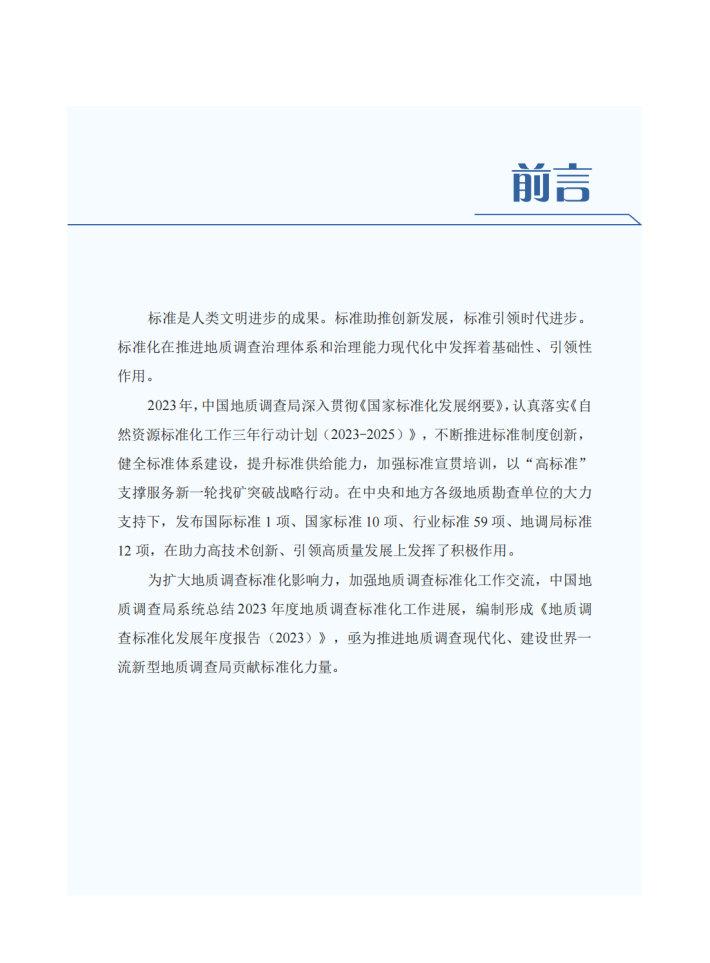标准是人类文明进步的成果。标准助推创新发展,标准引领时代进步。标准化在推进地质调查治理体系和治理能力现代化中发挥着基础性、引领性作用。
