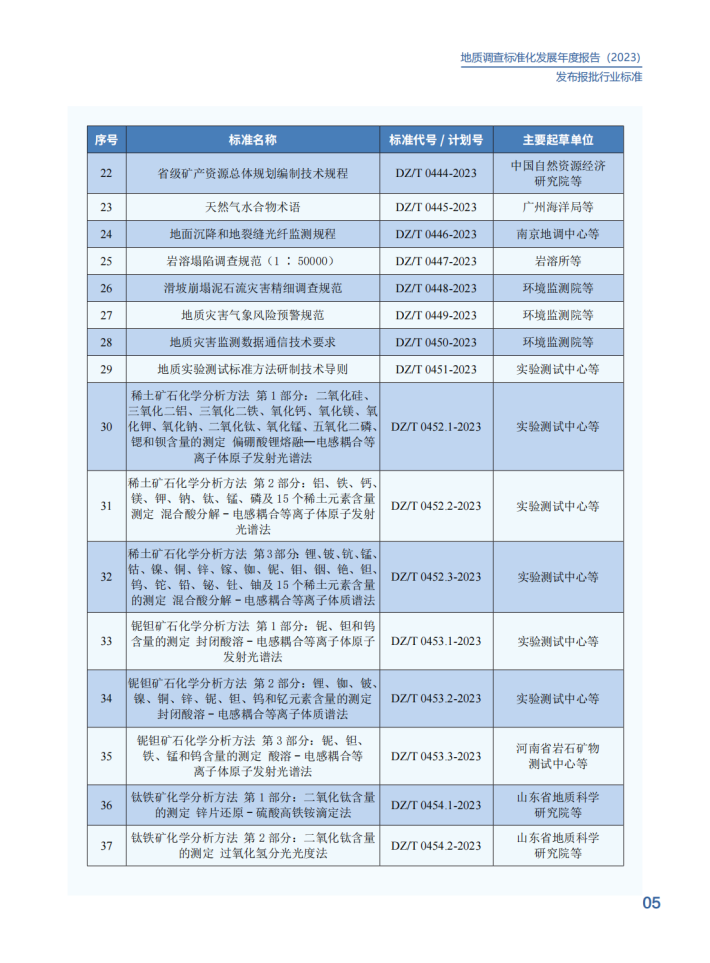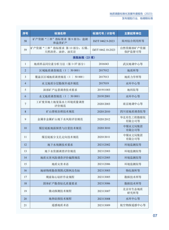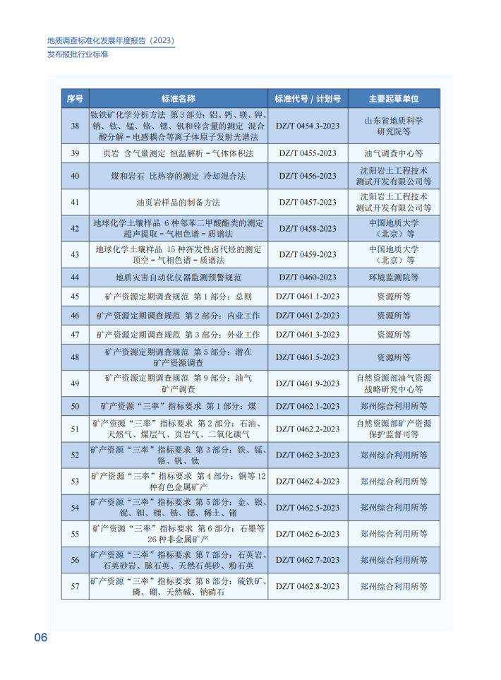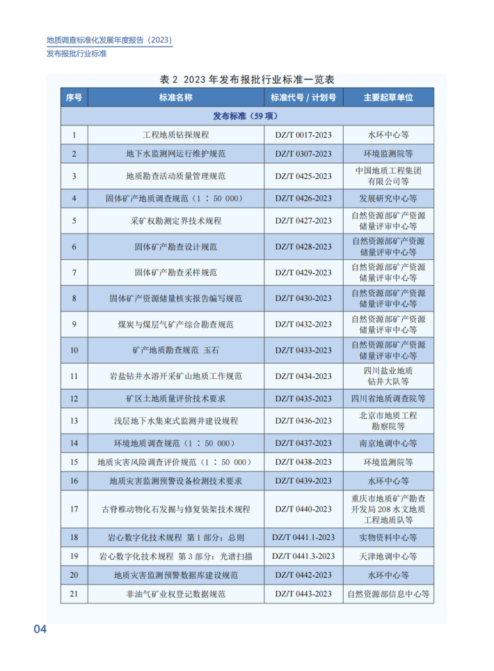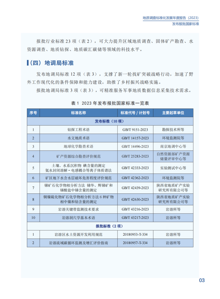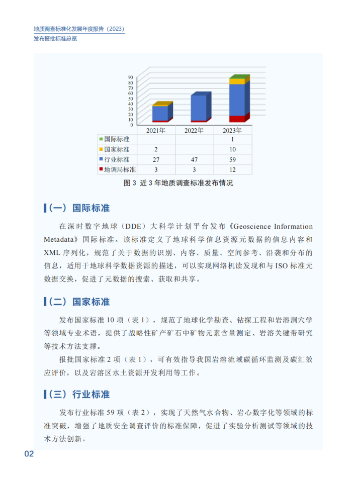 2023年,中国地质调查局深入贯彻《国家标准化发展纲要》,认真落实《自然资源标准化工作三年行动计划(2023-2025)》,不断推进标准制度创新,健全标准体系建设,提升标准供给能力,加强标准宣贯培训,以“高标准”支撑服务新一轮找矿突破战略行动。在中央和地方各级地质勘查单位的大力支持下,发布国际标准1项、国家标准10项、行业标准59项、地调局标准12项,在助力高技术创新、引领高质量发展上发挥了积极作用。