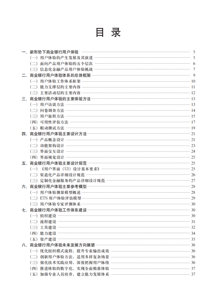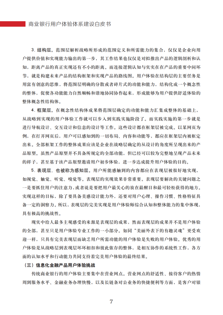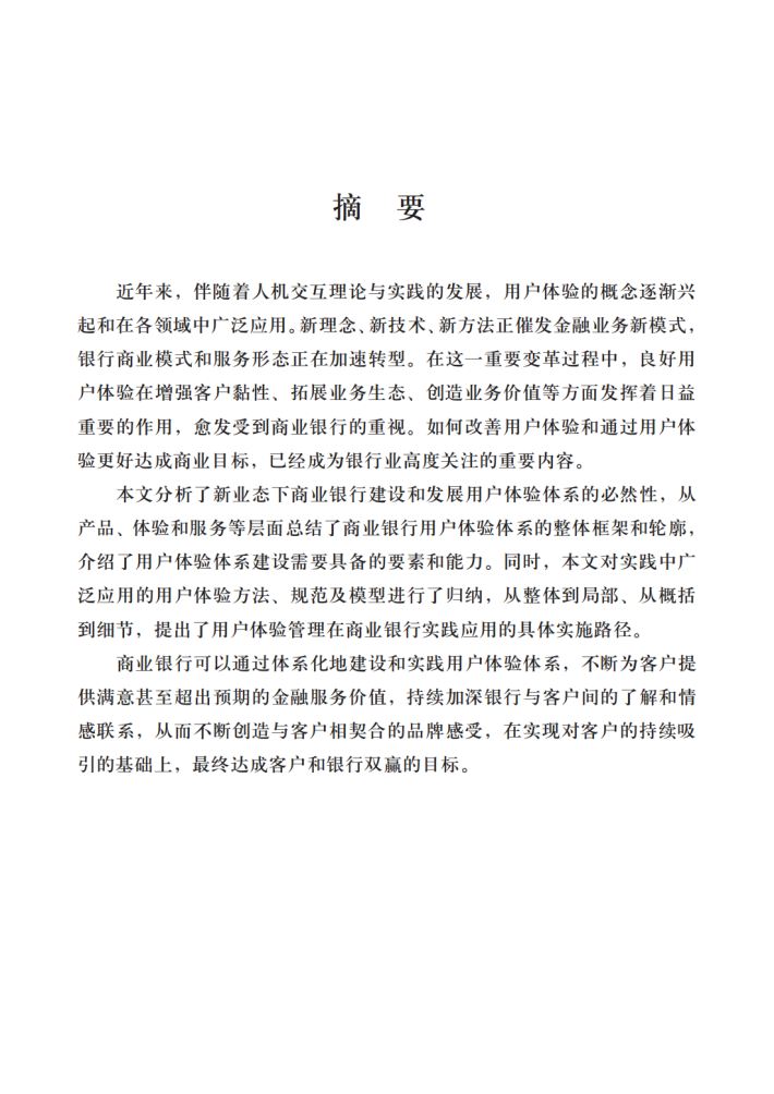 本文分析了新业态下商业银行建设和发展用户体验体系的必然性,从产品、体验和服务等层面总结了商业银行用户体验体系的整体框架和轮廓,介绍了用户体验体系建设需要具备的要素和能力。同时,本文对实践中广泛应用的用户体验方法、规范及模型进行了归纳,从整体到局部、从概括到细节,提出了用户体验管理在商业银行实践应用的具体实施路径。