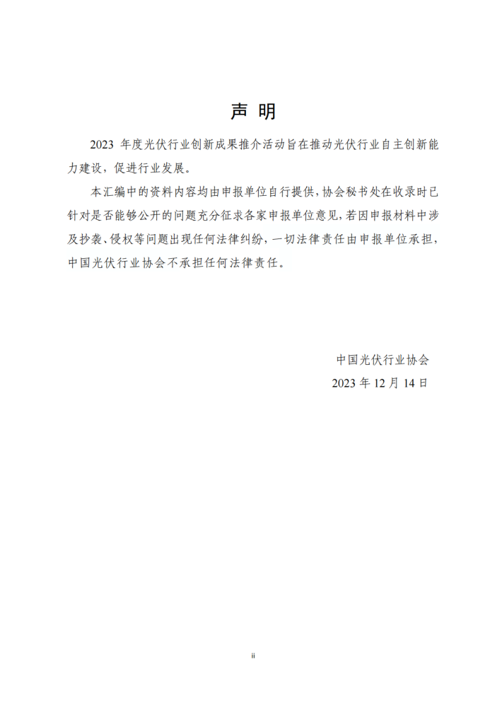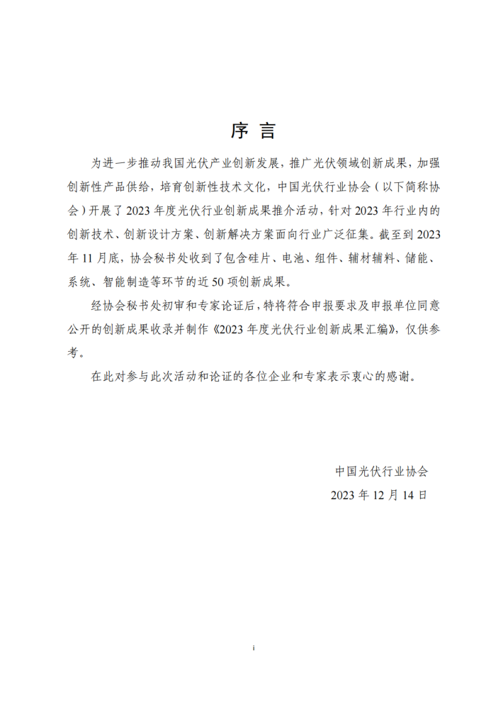 为进一步推动我国光伏产业创新发展,推广光伏领域创新成果,加强创新性产品供给,培育创新性技术文化,中国光伏行业协会(以下简称协会)开展了2023年度光伏行业创新成果推介活动,针对2023年行业内的创新技术、创新设计方案、创新解决方案面向行业广泛征集。截至到2023年11月底,协会秘书处收到了包含硅片、电池、组件、辅材辅料、储能、系统、智能制造等环节的近50项创新成果。