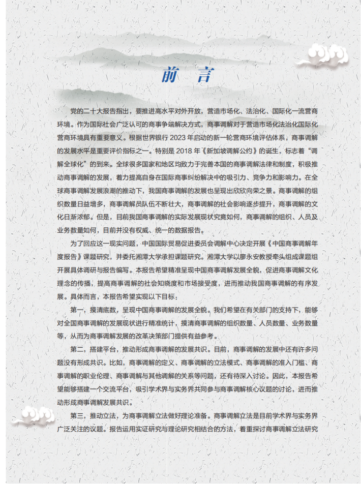 党的二十大报告指出,要推进高水平对外开放,营造市场化、法治化、国际化一流营商环境。作为国际社会广泛认可的商事争端解决方式,商事调解对于营造市场化法治化国际化营商环境具有重要意义。根据世界银行2023年启动的新一轮营商环境评估体系,商事调解的发展水平是重要评价指标之一。特别是2018年《新加坡调解公约》的诞生,标志着“调解全球化”的到来。全球很多国家和地区均致力于完善本国的商事调解法律和制度,积极推动商事调解的发展,着力提高自身在国际商事纠纷解决中的吸引力、竞争力和影响力。在全球商事调解发展浪潮的推动下,我国商事调解的发展也呈现出欣欣向荣之景。商事调解的组织数量日益增多,商事调解员队伍不断壮大,商事调解的社会影响逐步提升,商事调解的文化日渐浓郁。但是,目前我国商事调解的实际发展现状究竟如何,商事调解的组织、人员及业务数量如何,目前并没有权威、统一的数据报告。