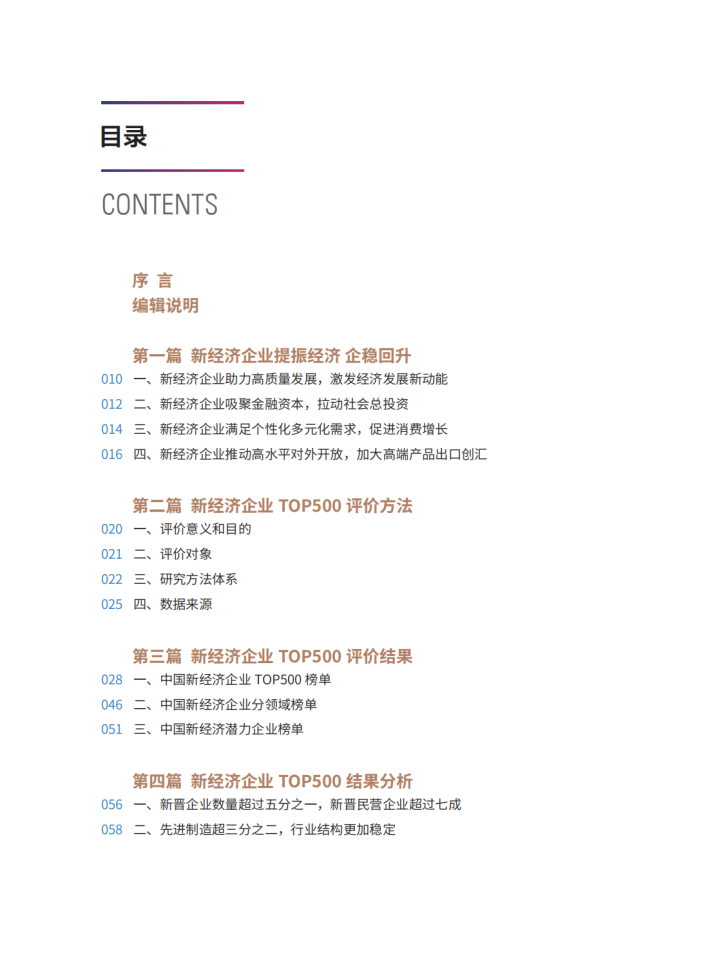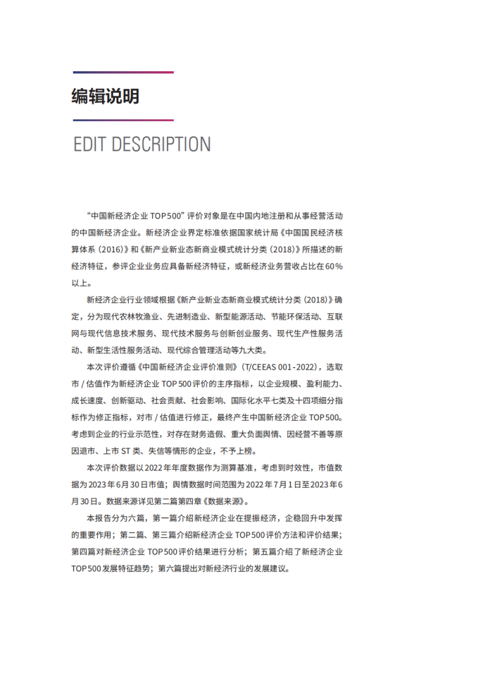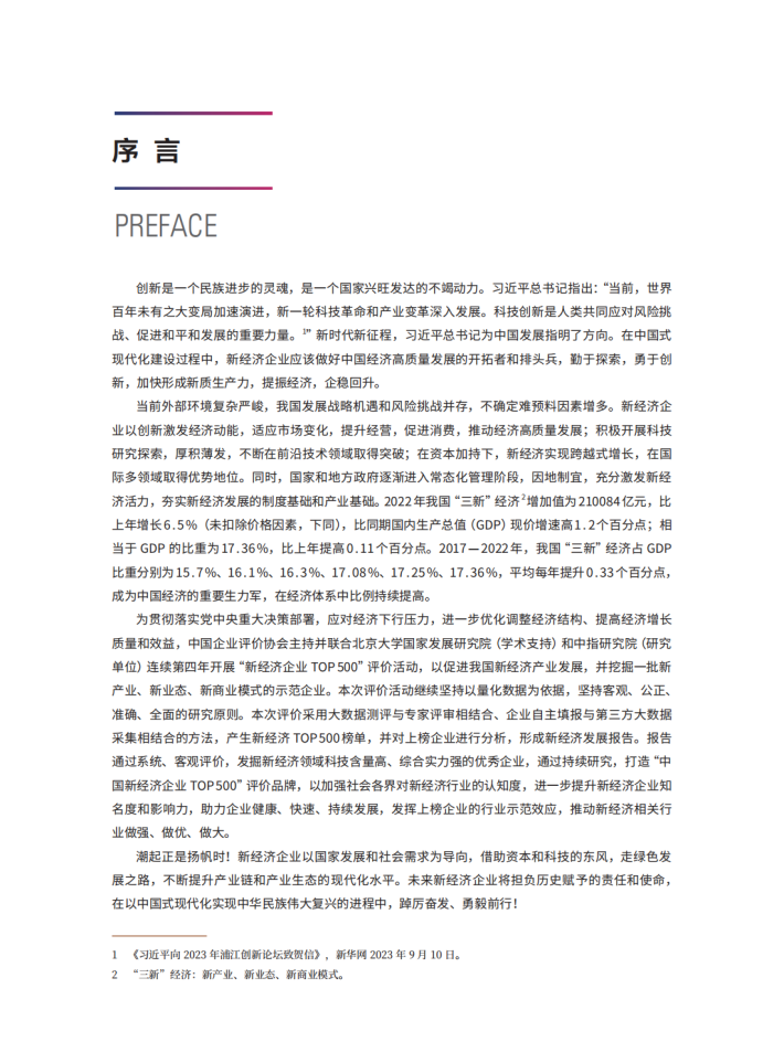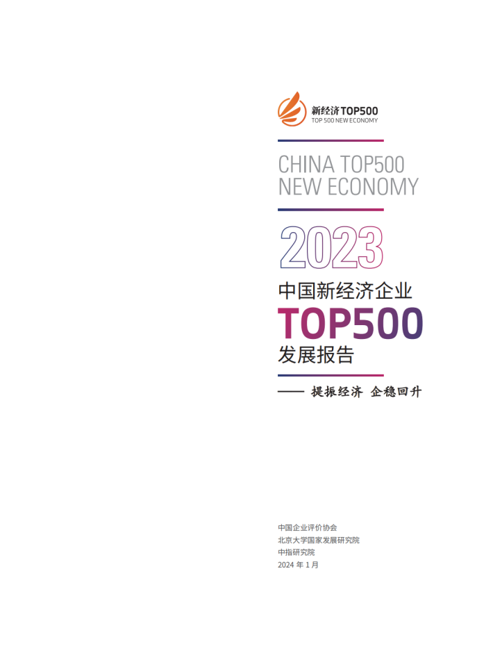 为贯彻落实党中央重大决策部署,应对经济下行压力,进一步优化调整经济结构、提高经济增长质量和效益,中国企业评价协会主持并联合北京大学国家发展研究院(学术支持)和中指研究院(研究单位)连续第四年开展“新经济企业TOP500”评价活动,以促进我国新经济产业发展,并挖掘一批新产业、新业态、新商业模式的示范企业。本次评价活动继续坚持以量化数据为依据,坚持客观、公正、准确、全面的研究原则。本次评价采用大数据测评与专家评审相结合、企业自主填报与第三方大数据采集相结合的方法,产生新经济TOP500榜单,并对上榜企业进行分析,形成新经济发展报告。报告通过系统、客观评价,发掘新经济领域科技含量高、综合实力强的优秀企业,通过持续研究,打造“中国新经济企业TOP500”评价品牌,以加强社会各界对新经济行业的认知度,进一步提升新经济企业知名度和影响力,助力企业健康、快速、持续发展,发挥上榜企业的行业示范效应,推动新经济相关行业做强、做优、做大。