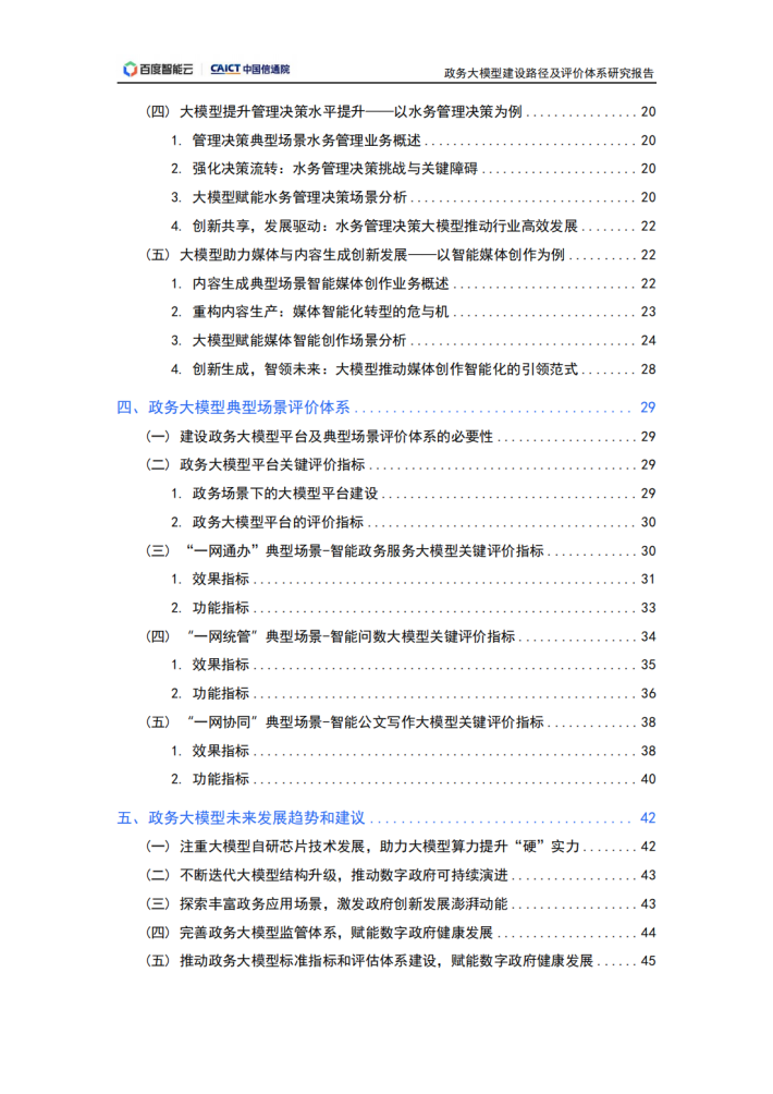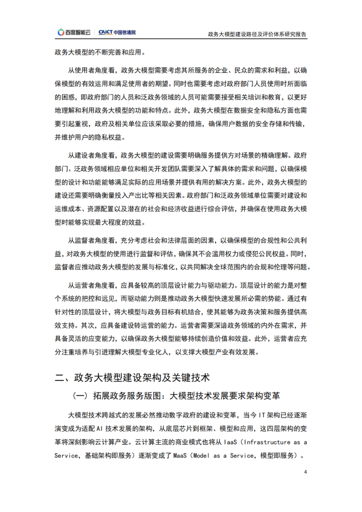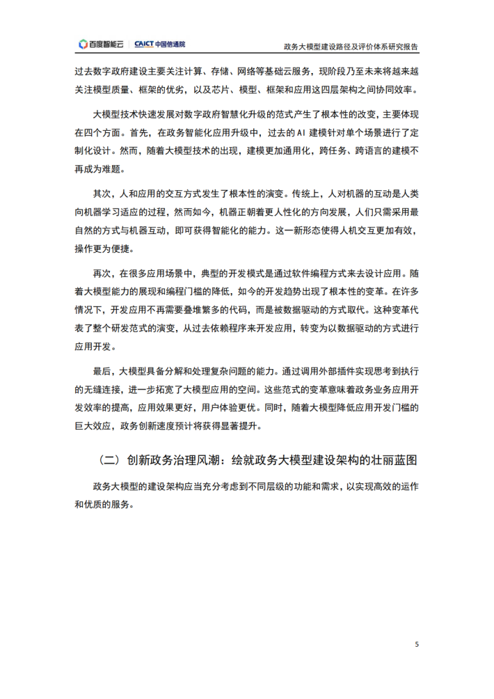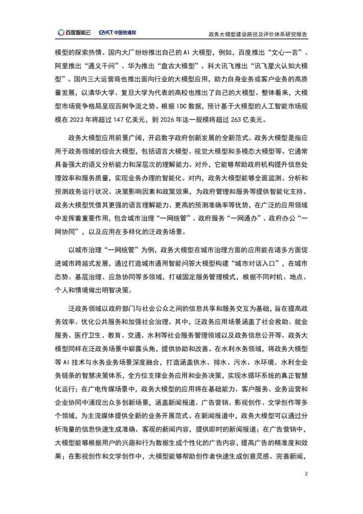 人工智能持续赋能千行百业,政务领域成为其典型落地场景之一。2023年,中共中央、国务院印发《数字中国建设整体布局规划》,旨在全面提升数字中国建设的整体性、系统性、协同性,促进数字经济和实体经济深度融合,以数字化驱动生产生活和治理方式变革,为以中国式现代化全面推进中华民族伟大复兴注入强大动力。当前,数字经济蓬勃发展,加强数字政府建设是适应新一轮科技革命和产业变革趋势、引领驱动数字经济发展和数字社会建设、营造良好数字生态、加快数字化发展的必然要求,是建设网络强国、数字中国的基础性和先导性工程。党中央、国务院高度重视运用数字技术创新行政方式、提高行政效能。2021年“十四五”规划纲要提出,将数字技术广泛应用于政府管理服务,推动政府治理流程再造和模式优化,不断提高决策科学性和服务效率。规划中瞄准人工智能等前沿领域,实施一批具有前瞻性、战略性的国家重大科技项目。人工智能等数字技术已经在数字政府相关“一网通办”、“一网统管”、“一网协同”等典型场景,以及智慧交通、水利水务、广电传媒等政务领域的创新实践中取得了积极成果,