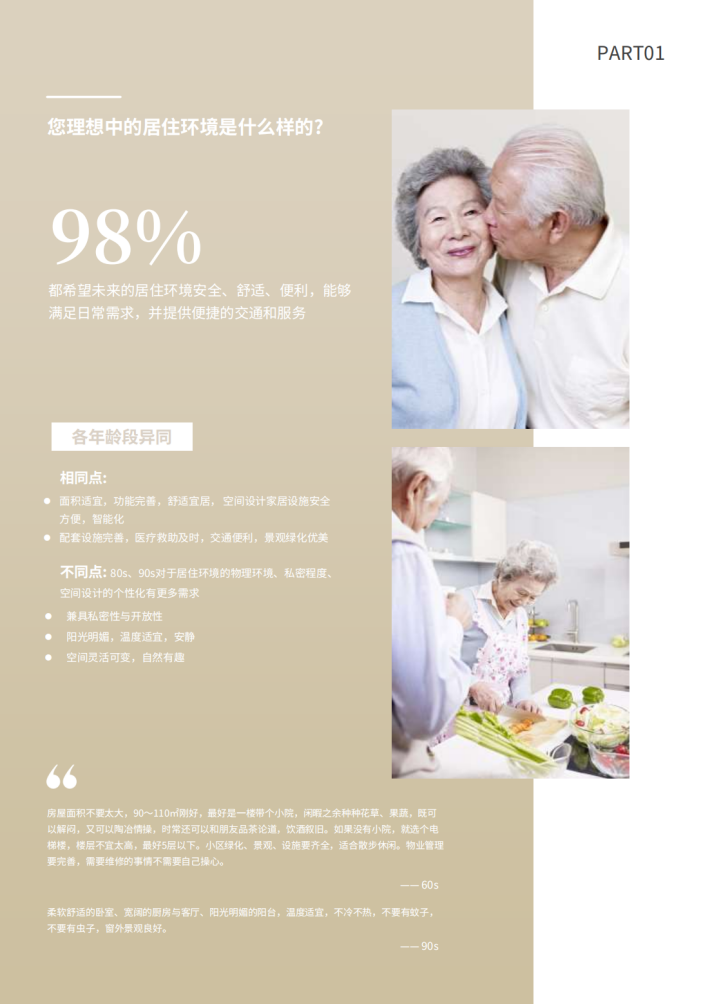 老年人在基础生活类、生活品质类、安全类均会遇到更多困难,如容易忘记带钥匙、使用智能化设备困难;易被噪音影响,容易产生孤独、低落等情绪;容易跌倒、容易忘记关火、关燃气、容易被家具磕碰。除此之外,还存在照护孙辈、配偶和父辈老人等困难。老年人认为居家便利生活需要满足行动省力、取物方便、动线流畅、操作简洁的特征。