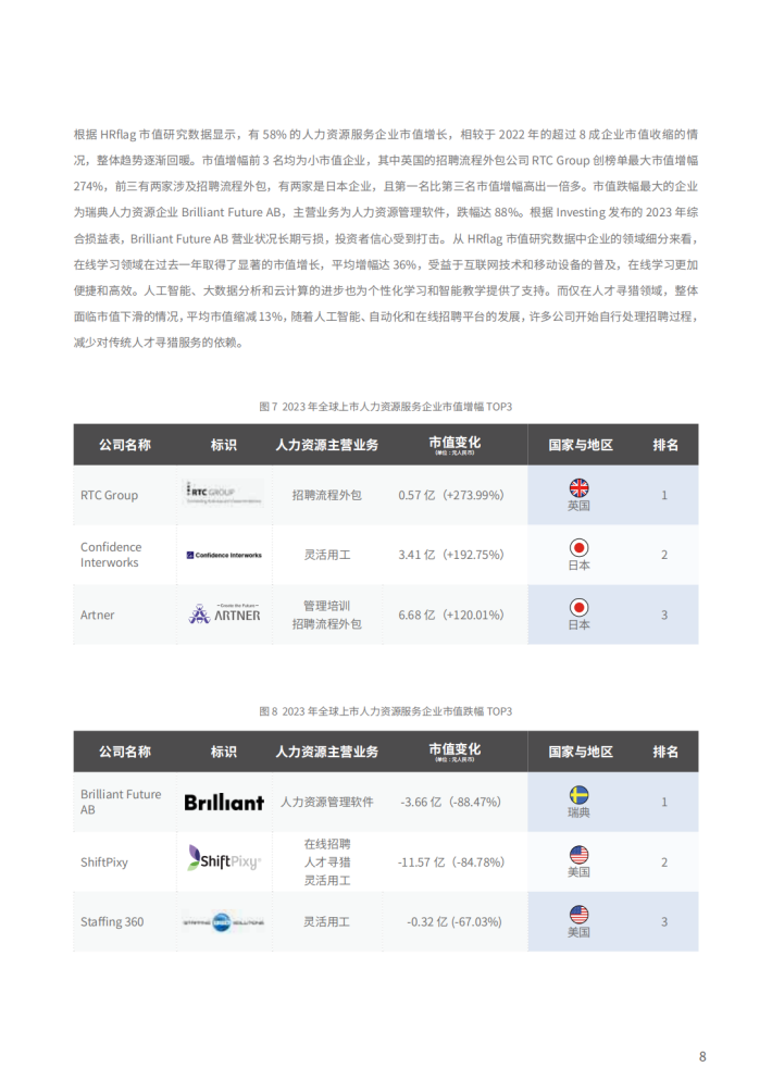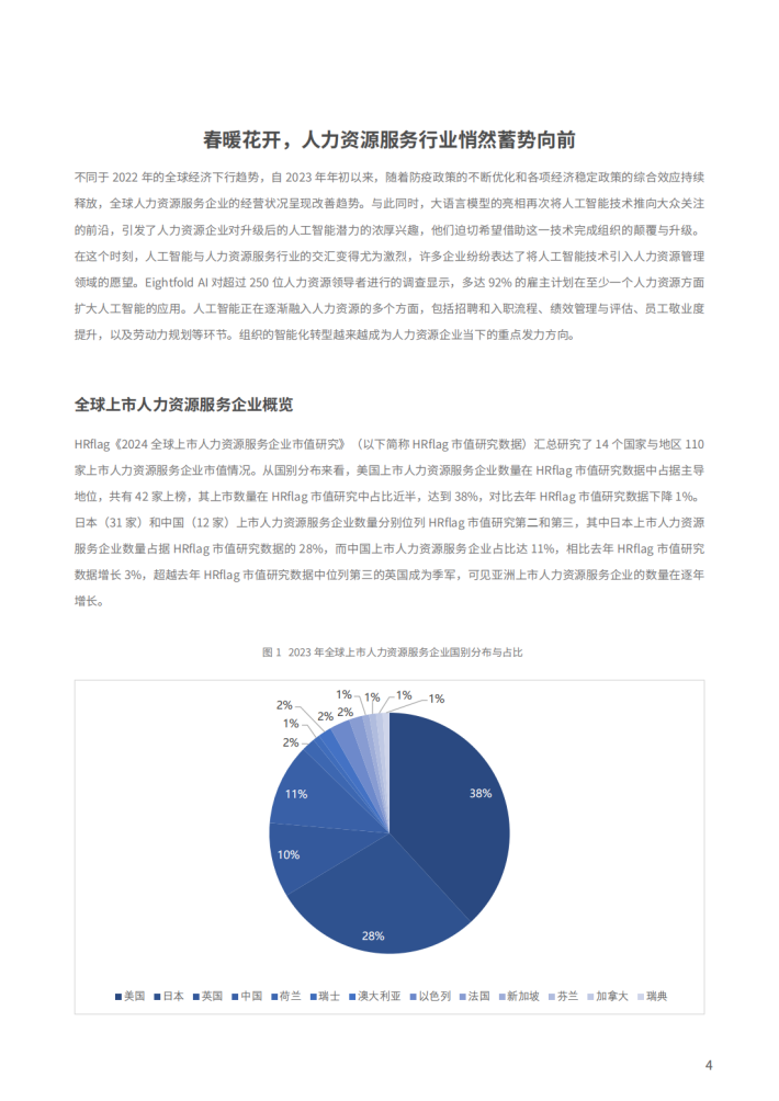 不同于2022年的全球经济下行趋势,自2023年年初以来,随着防疫政策的不断优化和各项经济稳定政策的综合效应持续释放,全球人力资源服务企业的经营状况呈现改善趋势。与此同时,大语言模型的亮相再次将人工智能技术推向大众关注的前沿,引发了人力资源企业对升级后的人工智能潜力的浓厚兴趣,他们迫切希望借助这一技术完成组织的颠覆与升级。在这个时刻,人工智能与人力资源服务行业的交汇变得尤为激烈,许多企业纷纷表达了将人工智能技术引入人力资源管理领域的愿望。Eightfold Al对超过250位人力资源领导者进行的调查显示,多达92%的雇主计划在至少一个人力资源方面扩大人工智能的应用。人工智能正在逐渐融入人力资源的多个方面,包括招聘和入职流程、绩效管理与评估、员工敬业度提升,以及劳动力规划等环节。组织的智能化转型越来越成为人力资源企业当下的重点发力方向。