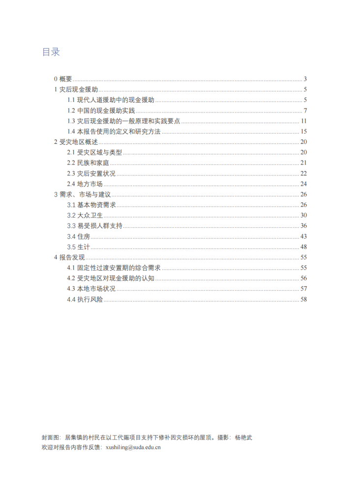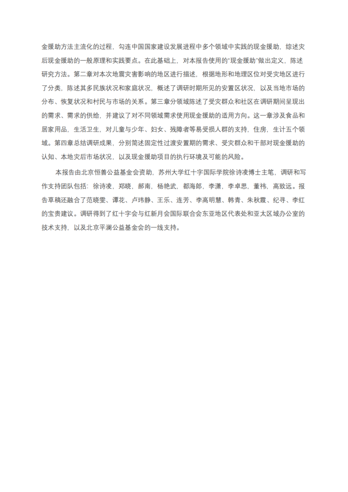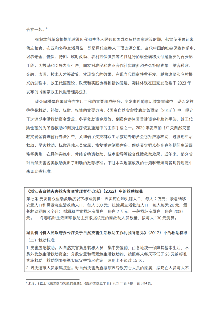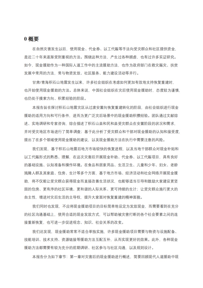 本报告旨在探讨积石山地震灾区从过渡安置向恢复重建转化的阶段,由社会组织进行现金援助的适用方向和可行条件,进而为更广泛灾后场景中的现金援助积攒经验。团队通过文献综述、实地调研和专家咨询,综合描述了积石山县和民和县受灾群众在安置阶段的状况和需求,并对受灾地区市场进行了简单调查;基于此分析了受灾群众和干部对现金援助的认知和接受度,