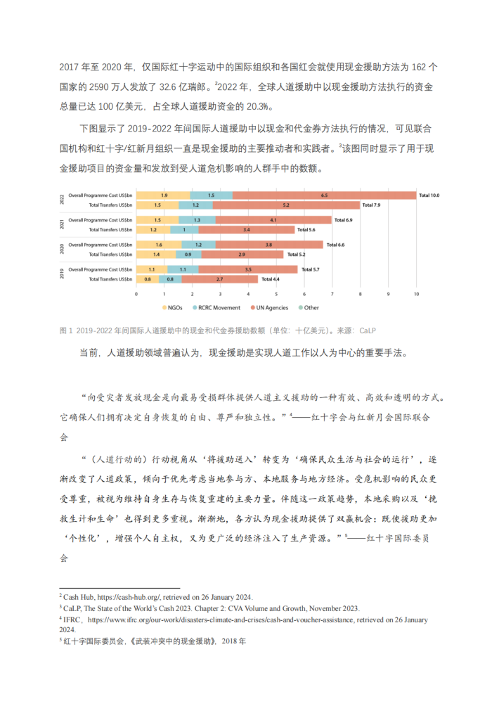 提出了在多个领域使用现金援助的建议,以及现金援助方法在执行中需要注意的风险。