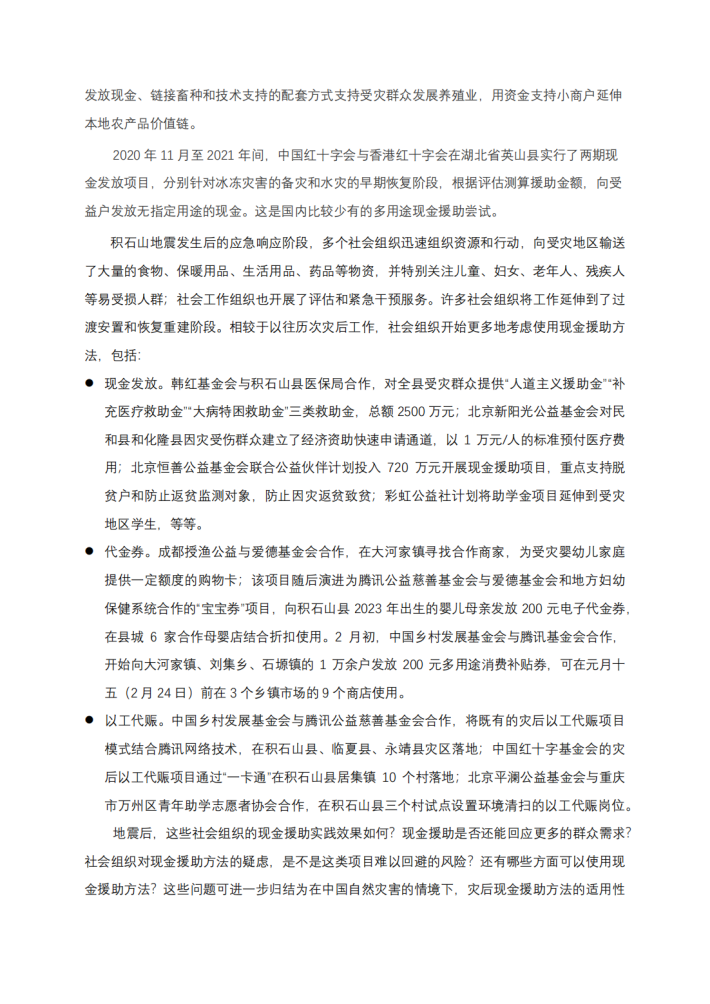 甘肃/青海积石山地震发生以来,许多社会组织在考虑如何更加有效地支持恢复重建时,也开始使用现金援助的方法。总体来说,中国社会组织在灾后使用现金援助时,态度较为谨慎,也仍处于摸索方向、积累经验的阶段。