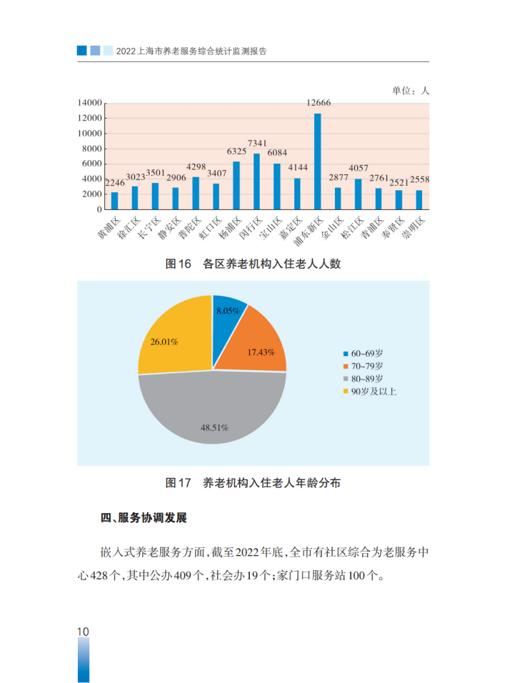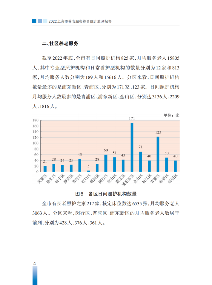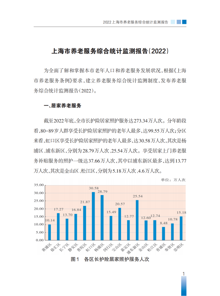 截至2022年底,全市长护险居家照护服务达273.34万人次。分年龄段看,80-89岁人群享受长护险居家照护的老年人最多,达99.55万人次;分区来看,虹口区享受长护险居家照护的老年人最多,达30.58万人次,其次是杨浦区、浦东新区,分别为28.79万人次、25.54万人次。享受居家上门养老服务补贴服务的照护一级达37.66万人次,其中以浦东新区最多,达到13.77万人次,其次是金山区、松江区,分别为5.18万人次、4.6万人次。