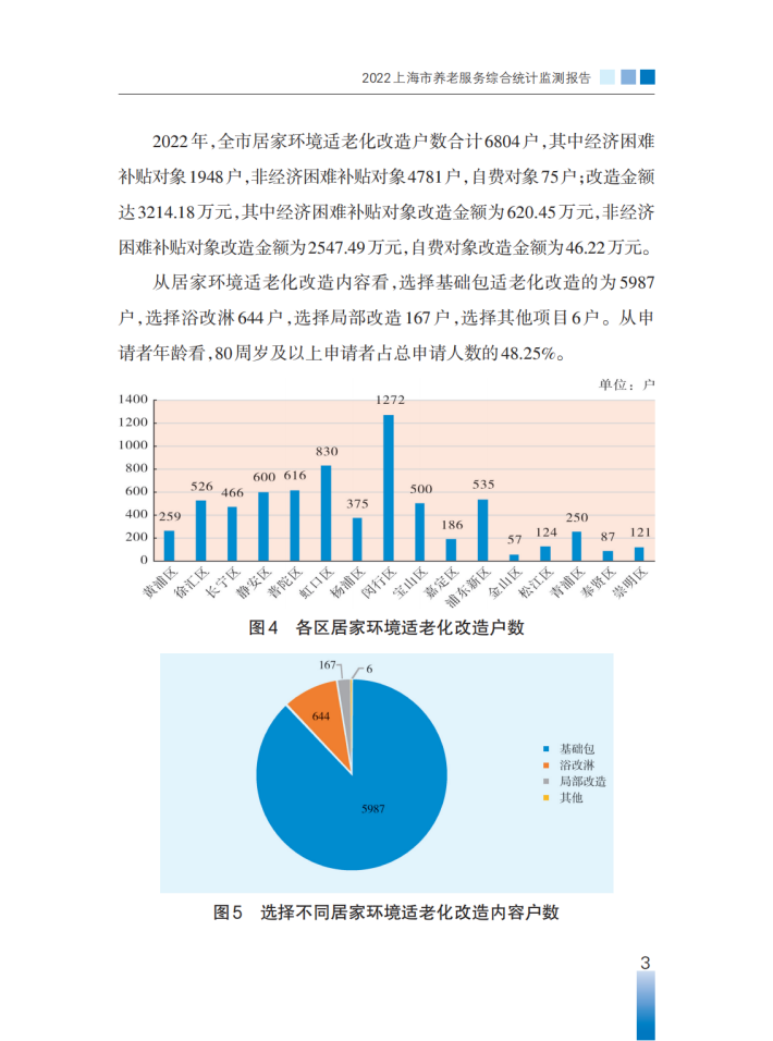 从居家环境适老化改造内容看,选择基础包适老化改造的为5987户,选择浴改淋644户,选择局部改造167户,选择其他项目6户。从申请者年龄看,80周岁及以上申请者占总申请人数的48.25%。