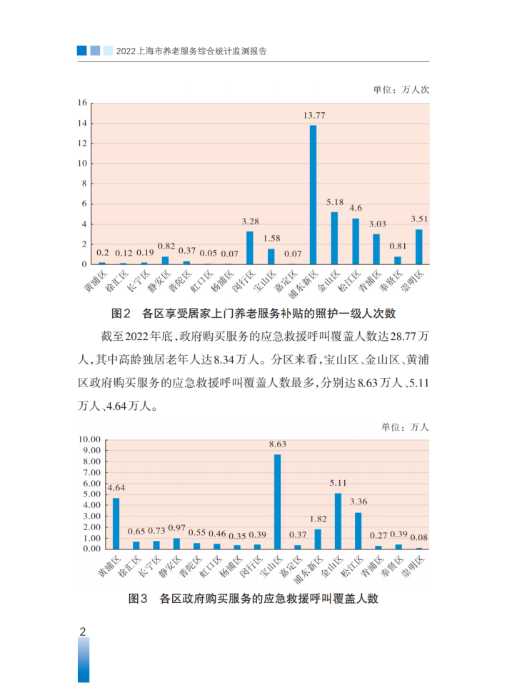 截至2022年底,政府购买服务的应急救援呼叫覆盖人数达28.77万人,其中高龄独居老年人达8.34万人。分区来看,宝山区、金山区、黄浦区政府购买服务的应急救援呼叫覆盖人数最多,分别达8.63万人、5.11万人、4.64万人。
