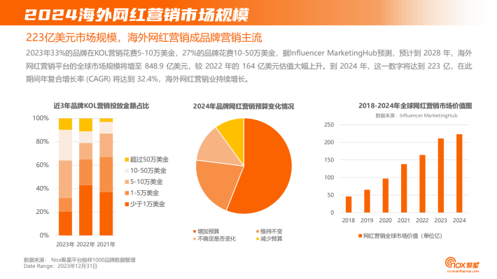2023年33%的品牌在KOL营销花费5-10万美金,27%的品牌花费10-50万美金,据Influencer MarketingHub预测,预计到2028年,海外网红营销平台的全球市场规模将增至848.9亿美元,较2022年的164亿美元估值大幅上升。到2024年,这一数字将达到223亿,在此期间年复合增长率(CAGR)将达到32.4%,海外网红营销业持续增长。
