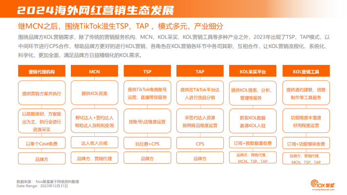 围绕品牌方KOL营销需求,除了传统的营销服务机构、MCN、KOL采买、KOL营销工具等多种产业之外,2023年出现了TSP、TAP模式,以中间环节进行CPS合作,帮助品牌方更好的进行KOL营销,各角色在KOL营销各环节中各司其职,互相合作,让KOL营销流程化、系统化、科学化,更加全面,满足品牌方日益精细化的KOL需求。