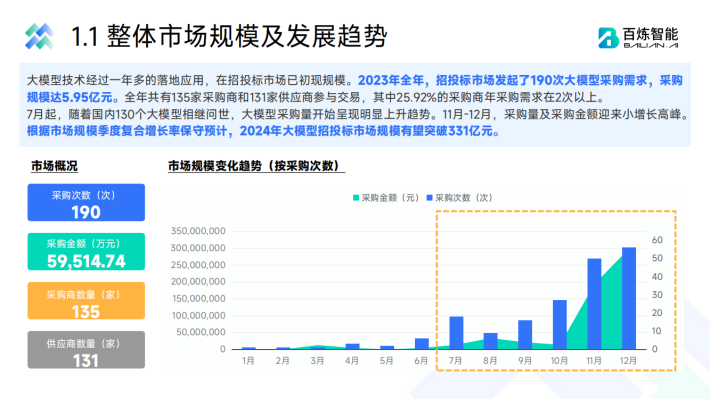 市场概览:2023年全年,招投标市场已经发起190次大模型采购需求,采购规模达5.95亿元,相关项目相继在16个行业落地。根据增速保守预计,2024年大模型招投标市场规模有望突破331亿元。