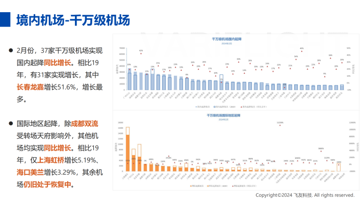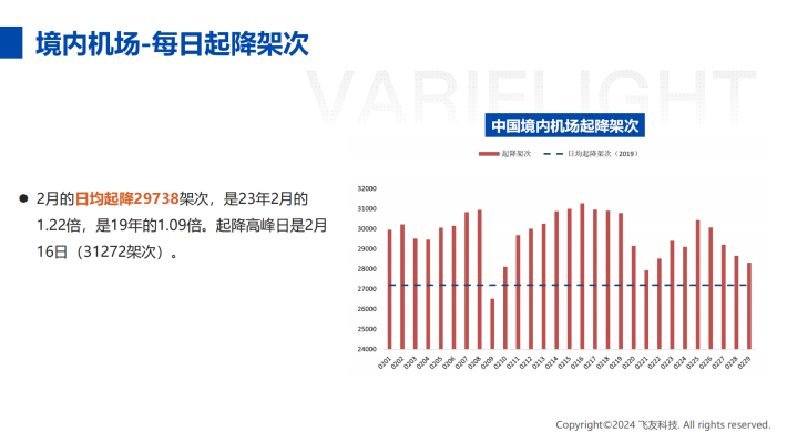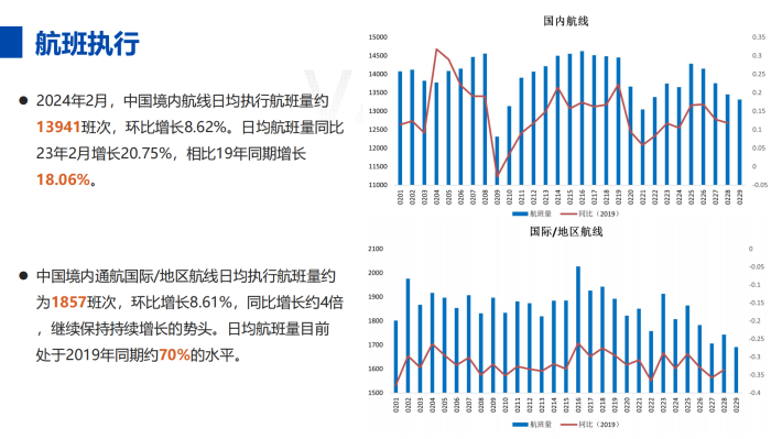 2024年2月,中国境内航线日均执行航班量约13941班次,环比增长8.62%。日均航班量同比23年2月增长20.75%,相比19年同期增长18.06%。