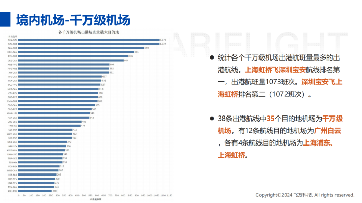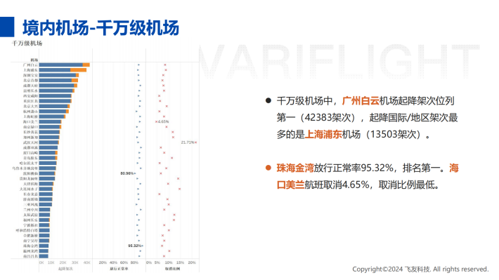2024年2月,千万级机场中,广州白云机场起降架次位列第一,起降国际/地区架次最多的是上海浦东机场。珠海金湾放行正常率排名第一。海口美兰航班取消比例最低。38个千万级机场的航班近机位平均靠桥率为81.90%。