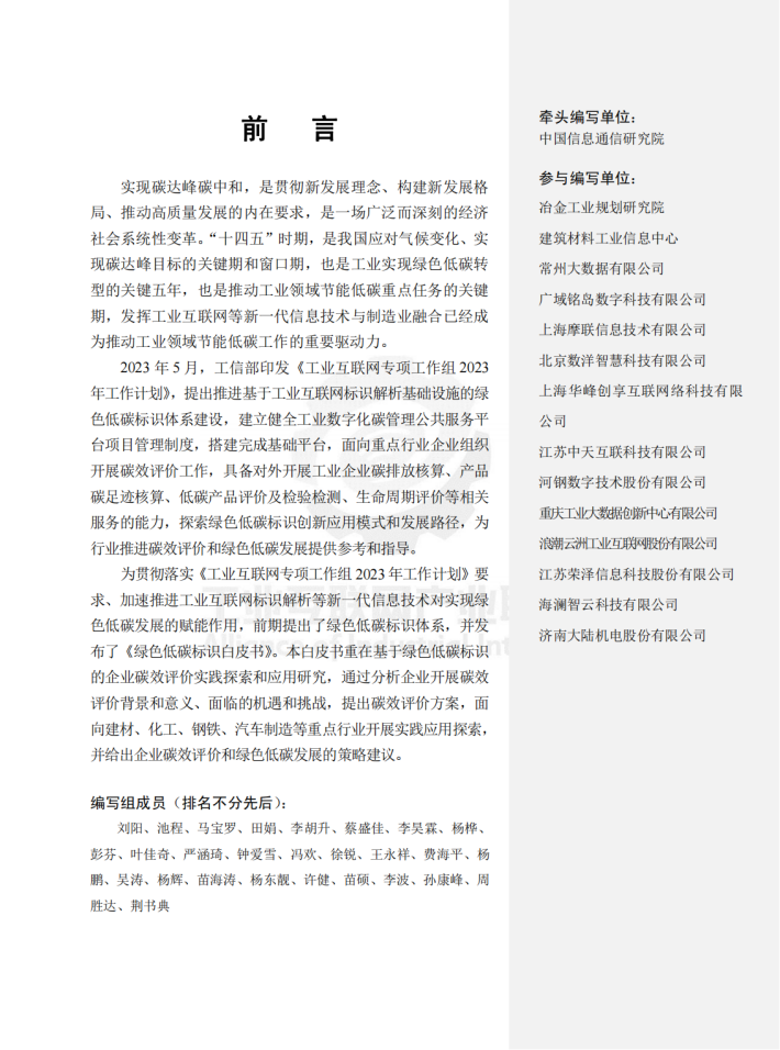 为贯彻落实《工业互联网专项工作组2023年工作计划》要求、加速推进工业互联网标识解析等新一代信息技术对实现绿色低碳发展的赋能作用,前期提出了绿色低碳标识体系,并发布了《绿色低碳标识白皮书》。本白皮书重在基于绿色低碳标识的企业碳效评价实践探索和应用研究,通过分析企业开展碳效评价背景和意义、面临的机遇和挑战,提出碳效评价方案,面向建材、化工、钢铁、汽车制造等重点行业开展实践应用探索,并给出企业碳效评价和绿色低碳发展的策略建议。