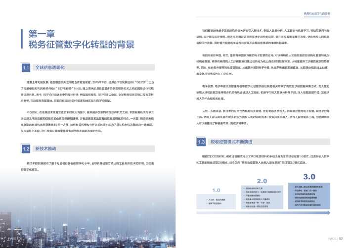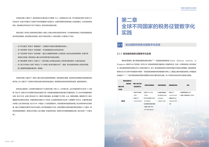 在互联网、人工智能、大数据、移动互联网的驱动下,数字经济蓬勃发展,给全球税务机关和税务征管带来了新的机遇和挑战。基于经济合作与发展组织(“OECD”)在2020年提出的以税收征管数字化转型为主要内容的税收征管3.0的愿景,税务机关将成为数字政府的组成部分,能够更加有效地实现税收监管,避免税源流失。因此,采用先进技术,进行税务征管数字化转型已经成为当前很多国家税收征管改革实践的普遍做法。那么如何利用好数字化技术,精准化、个性化、智能化地提升征管能力已成为全球税务机关的共识和变革趋势。