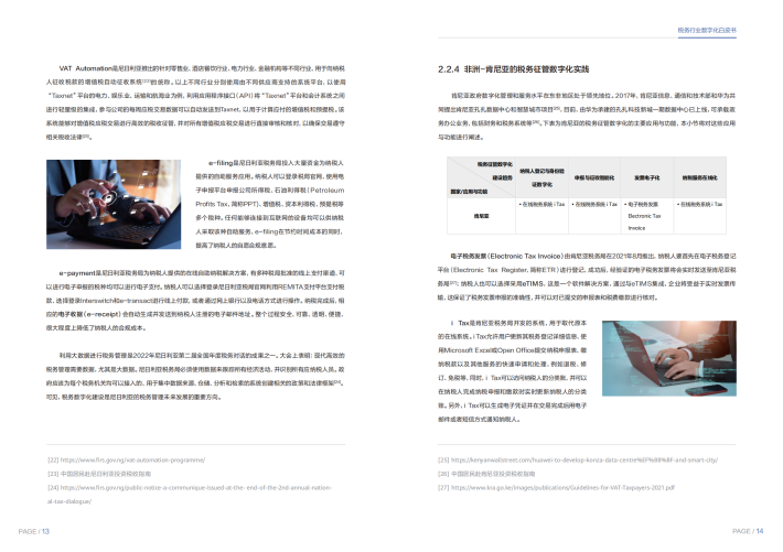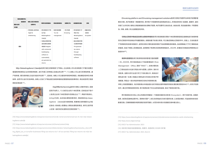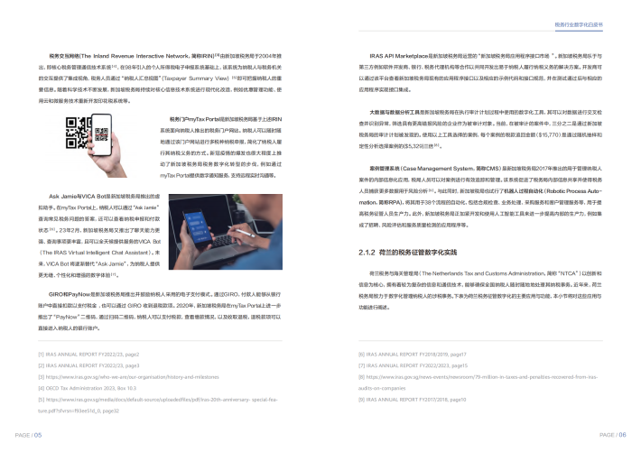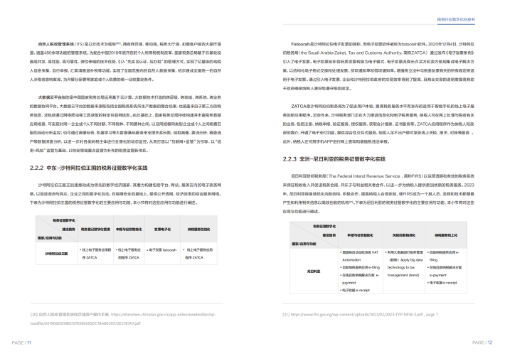 我们精选了全球各个地区中的8个典型国家税务数字化转型的实践案例,梳理数字化转型的脉络和关键要素,从纳税人管理、申报征收、风险监控、发票管理、纳税服务等几个方面的数字化发展方向进行研究。例如,新加坡作为发达国家,在税务征管数字化领域已采取多种数字化举措,实现了纳税人登记与身份验证数字化、申报与征收智能化、风险控制精准化、纳税服务在线化并且将继续利用数据、科学和人工智能以更好地服务纳税人并增强其合规能力;中国作为发展中国家,在税务征管数字化领域启动了以“金税四期”工程为主要内容的“智慧税务”建设,实现了税务征管方式从“以票管税”向“以数治税”的转变。我们也看到近年来尼日利亚、肯尼亚、喀麦隆等非洲国家的数字化转型已经成为其税务管理发展的重要方向。