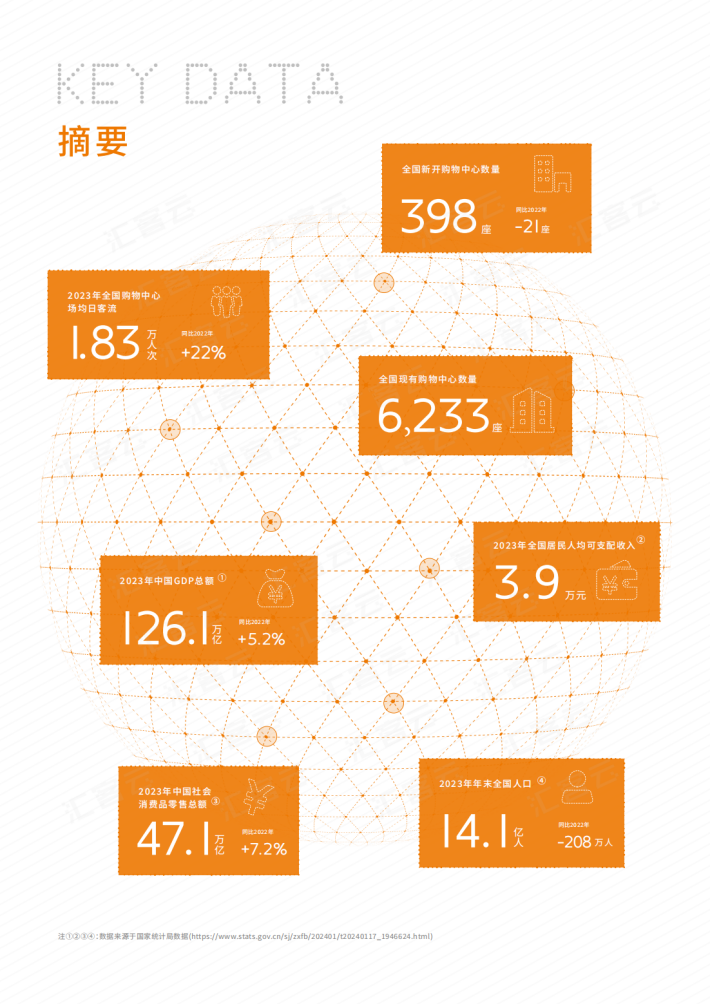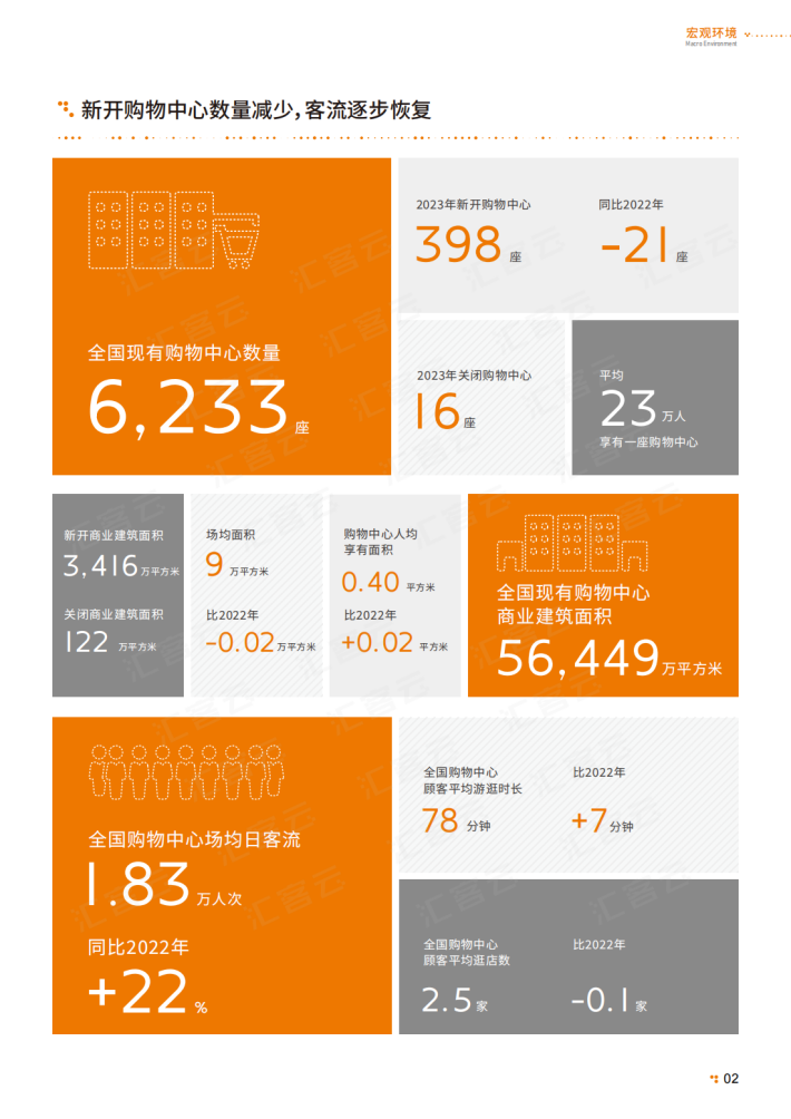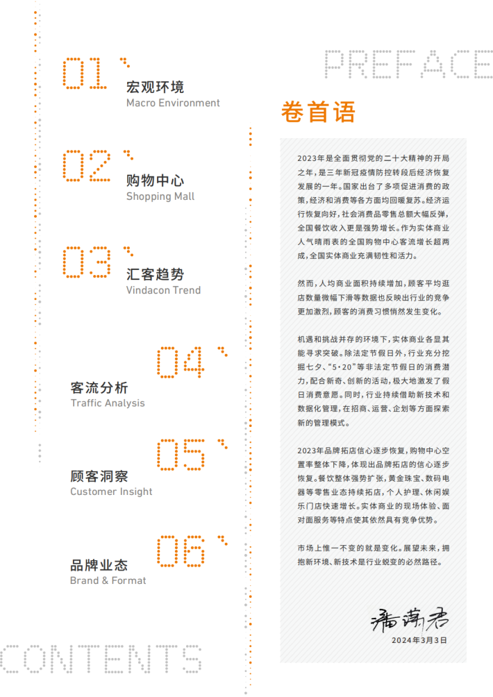 2023年是全面贯彻党的二十大精神的开局之年,是三年新冠疫情防控转段后经济恢复发展的一年。国家出台了多项促进消费的政策,经济和消费等各方面均回暖复苏。经济运行恢复向好,社会消费品零售总额大幅反弹,全国餐饮收入更是强势增长。作为实体商业人气晴雨表的全国购物中心客流增长超两成,全国实体商业充满韧性和活力。