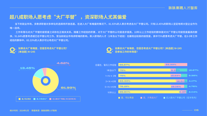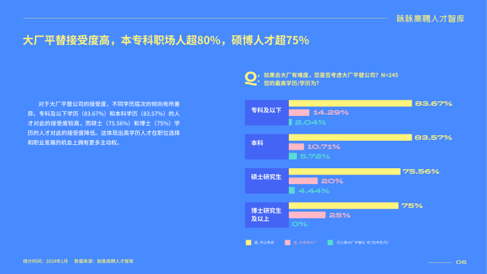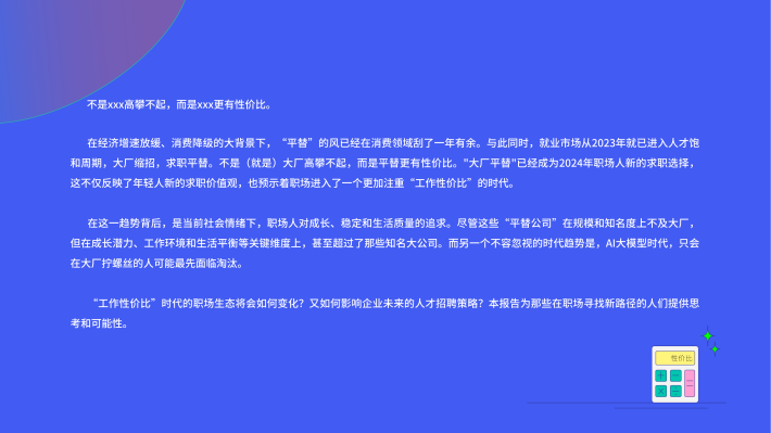 在经济增速放缓、消费降级的大背景下,“平替”的风已经在消费领域刮了一年有余。与此同时,就业市场从2023年就已进入人才饱和周期,大厂缩招,求职平替。不是(就是)大厂高攀不起,而是平替更有性价比。"大厂平替"已经成为2024年职场人新的求职选择,这不仅反映了年轻人新的求职价值观,也预示着职场进入了一个更加注重“工作性价比”的时代。