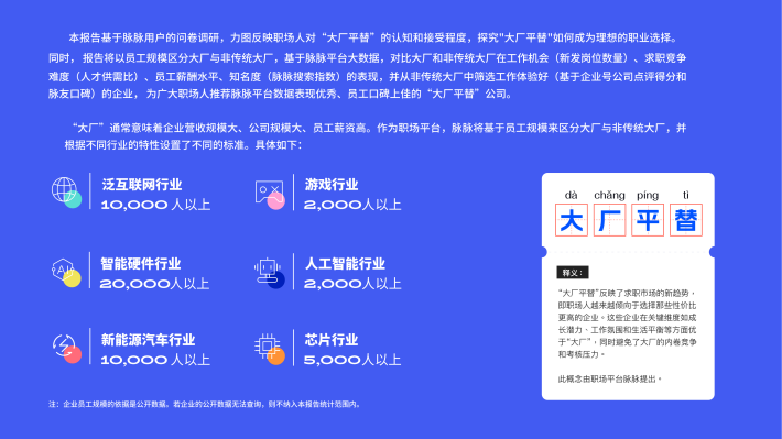 本报告基于脉脉用户的问卷调研,力图反映职场人对“大厂平替”的认知和接受程度,探究"大厂平替"如何成为理想的职业选择。同时,报告将以员工规模区分大厂与非传统大厂,基于脉脉平台大数据,对比大厂和非传统大厂在工作机会(新发岗位数量)、求职竞争难度(人才供需比)、员工薪酬水平、知名度(脉脉搜索指数)的表现,并从非传统大厂中筛选工作体验好(基于企业号公司点评得分和脉友口碑)的企业,为广大职场人推荐脉脉平台数据表现优秀、员工口碑上佳的“大厂平替”公司。
