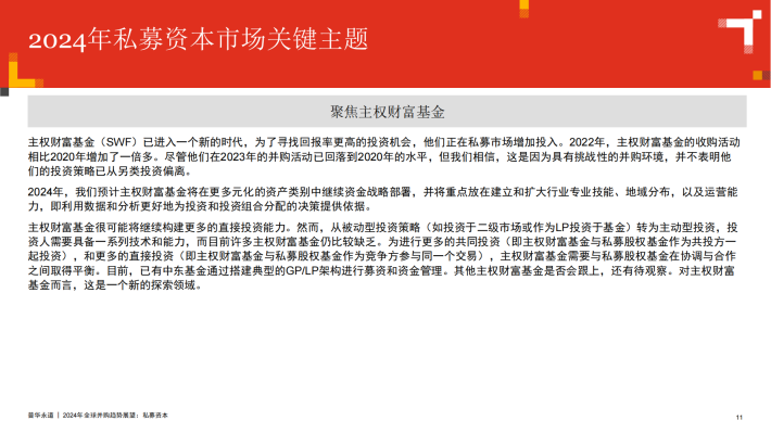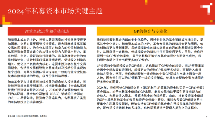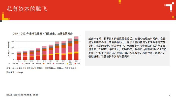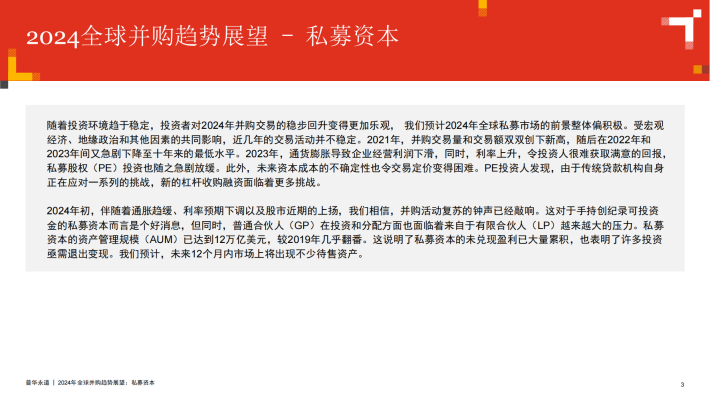 2024年初,伴随着通胀趋缓、利率预期下调以及股市近期的上扬,我们相信,并购活动复苏的钟声已经敲响。这对于手持创纪录可投资金的私募资本而言是个好消息,但同时,普通合伙人(GP)在投资和分配方面也面临着来自于有限合伙人(LP)越来越大的压力。私募资本的资产管理规模(AUM)已达到12万亿美元,较2019年几乎翻番。这说明了私募资本的未兑现盈利已大量累积,也表明了许多投资亟需退出变现。我们预计,未来12个月内市场上将出现不少待售资产。