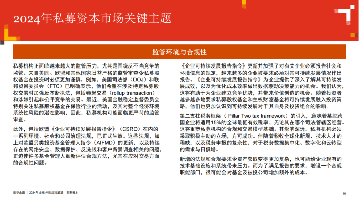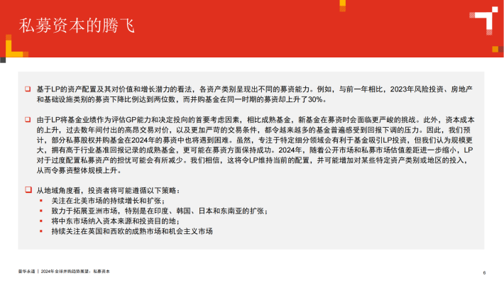 随着投资环境趋于稳定,投资者对2024年并购交易的稳步回升变得更加乐观,我们预计2024年全球私募市场的前景整体偏积极。受宏观经济、地缘政治和其他因素的共同影响,近几年的交易活动并不稳定。2021年,并购交易量和交易额双双创下新高,随后在2022年和2023年间又急剧下降至十年来的最低水平。2023年,通货膨胀导致企业经营利润下滑,同时,利率上升,令投资人很难获取满意的回报,私募股权(PE)投资也随之急剧放缓。此外,未来资本成本的不确定性也令交易定价变得困难。PE投资人发现,由于传统贷款机构自身正在应对一系列的挑战,新的杠杆收购融资面临着更多挑战。