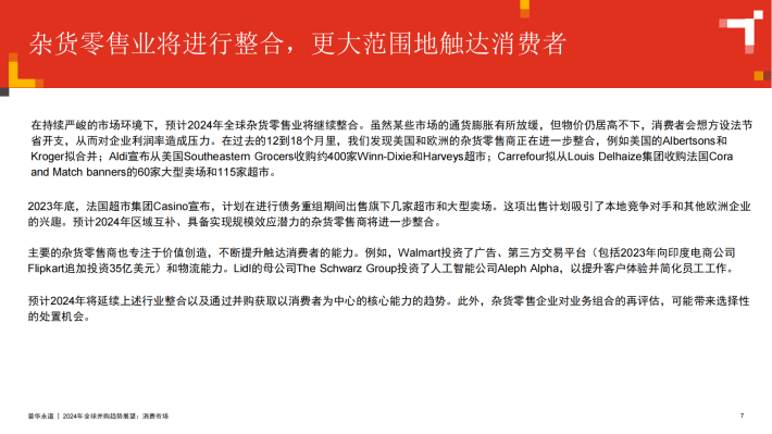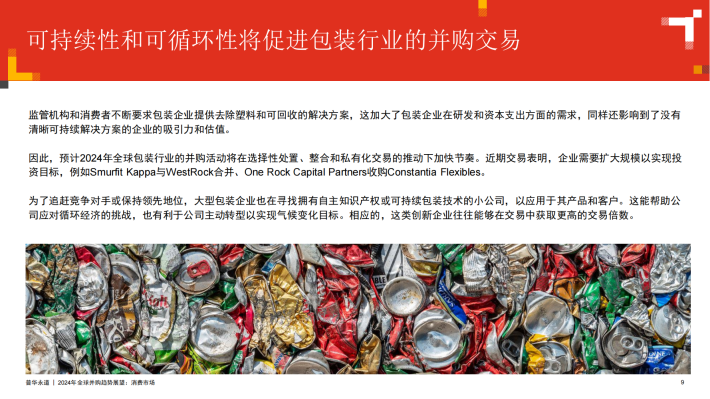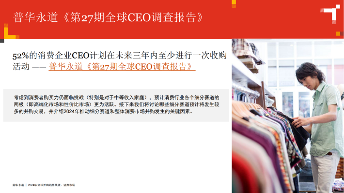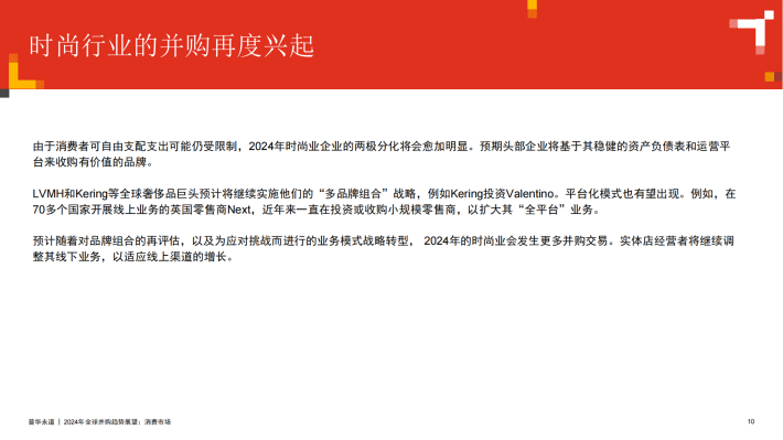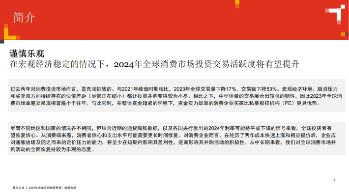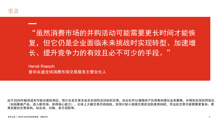 尽管不同地区和国家的情况各不相同,但结合近期的通货膨胀数据,以及各国央行发出的2024年利率可能持平或下降的信号来看,全球投资者有望恢复信心。从消费端来看,消费者信心和支出水平可能需要更长时间修复。对消费企业而言,在经历了两年成本快速上涨和相应提价后,企业应对通胀放缓及随之而来的定价压力的能力,将至少在短期内影响其盈利性,进而影响其并购活动的积极性。从中长期来看,我们对全球消费市场并购活动的全面恢复持较为乐观的态度。