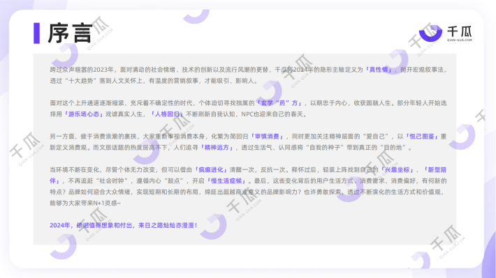 跨过众声喧嚣的2023年,面对涌动的社会情绪、技术的创新以及流行风潮的更替,千瓜将2024年的隐形主轴定义为「真性情」,抛开宏观叙事法,透过“十大趋势”落到人文关怀上,有温度的营销叙事,才能吸引、影响人。