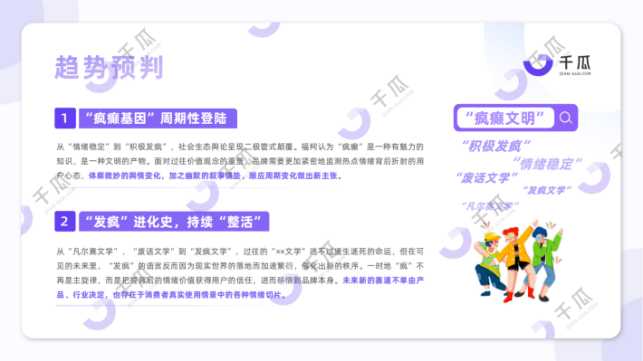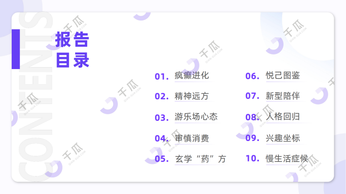 当环境不断在变化,尽管个体无力改变,但可以借由「疯癫进化」清醒一次,反抗一次。释怀过后,轻装上阵找到自己的「兴趣坐标」、「新型陪伴」,不再追赶“社会时钟”,遵循内心“鼓点”,开启「慢生活症候」。最后,这些变化背后的用户生活方式、消费需求、消费偏好,有何新的特点?品牌如何迎合大众情绪,实现短期和长期的布局,绵延出超越商业意义的品牌影响力?也许勇敢探索,透过不断演化的生活方式和价值观,能够为大家带来N+1灵感~