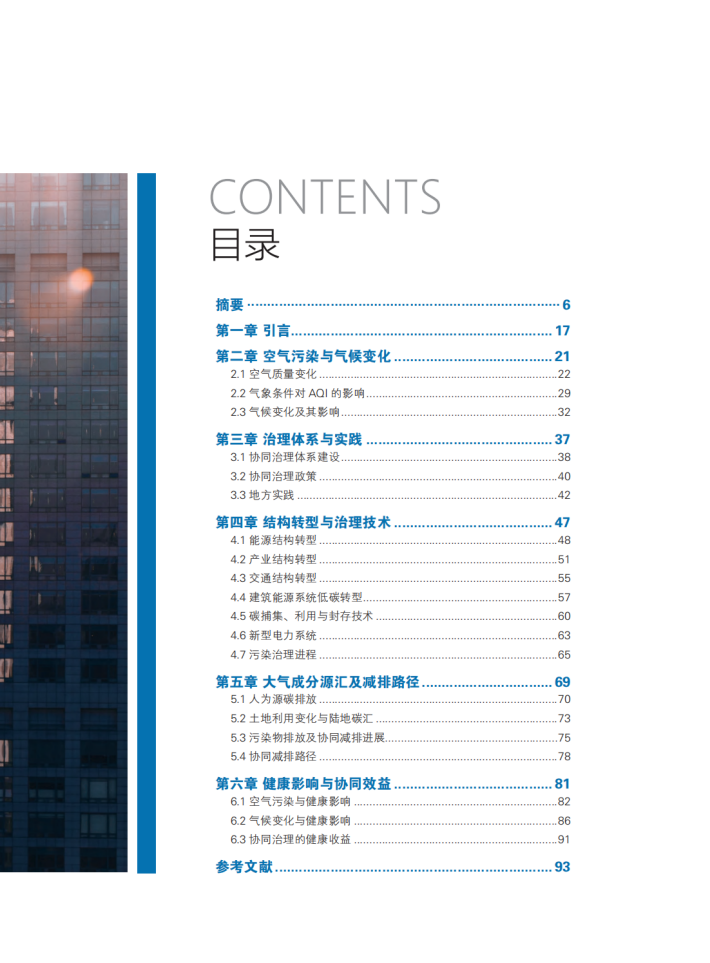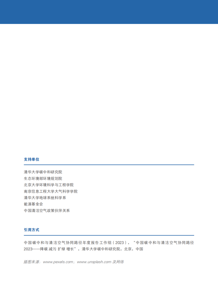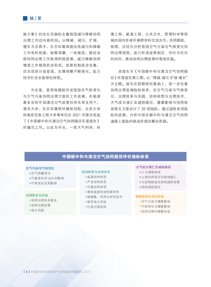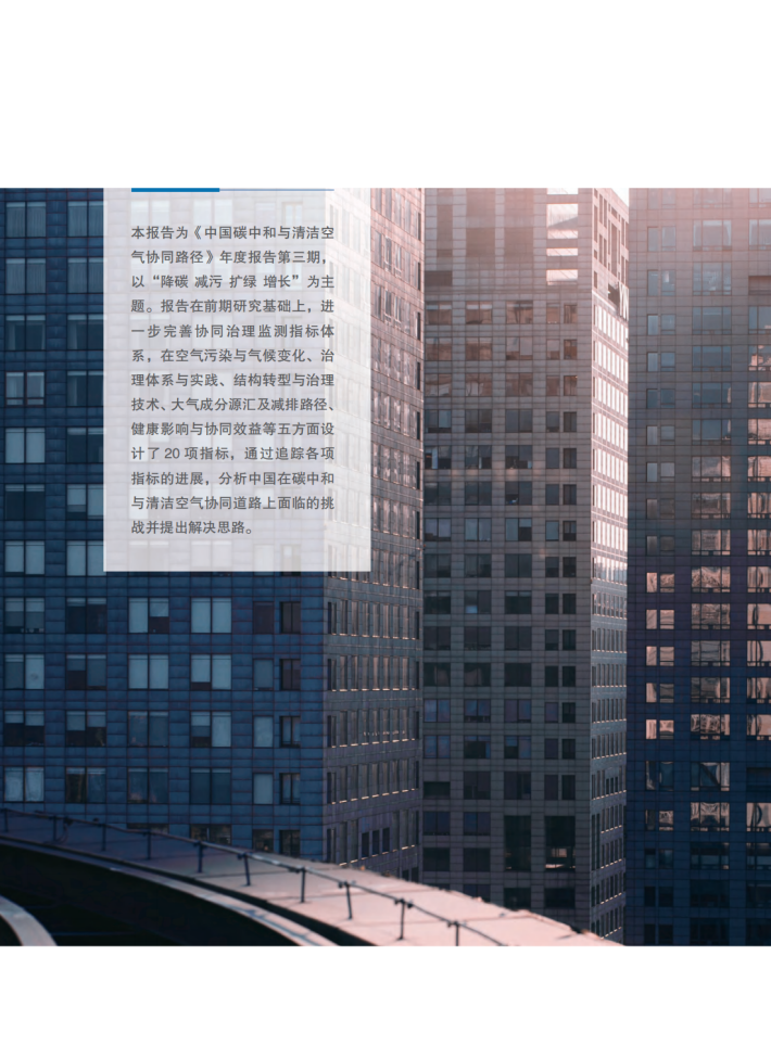 本报告为《中国碳中和与清洁空气协同路径》年度报告第三期,以“降碳减污扩绿增长”为主题。报告在前期研究基础上,进一步完善协同治理监测指标体系,在空气污染与气候变化、治理体系与实践、结构转型与治理技术、大气成分源汇及减排路径、健康影响与协同效益等五方面设计了20项指标,通过追踪各项指标的进展,分析中国在碳中和与清洁空气协同道路上面临的挑战并提出解决思路。