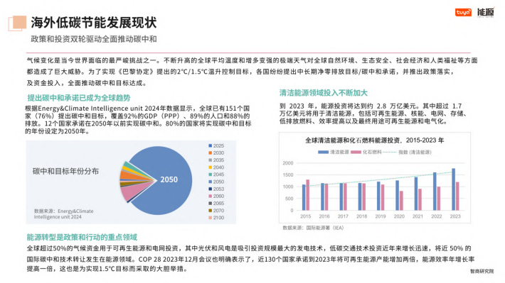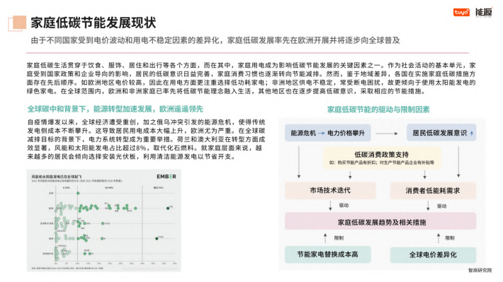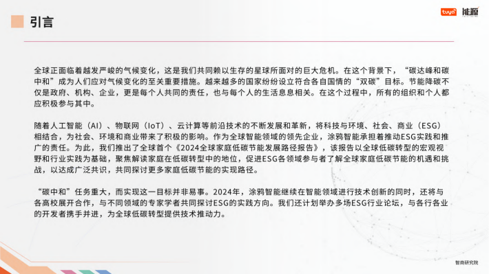 随着人工智能(Al)、物联网(IoT)、云计算等前沿技术的不断发展和革新,将科技与环境、社会、商业(ESG)相结合,为社会、环境和商业带来了积极的影响。作为全球智能领域的领先企业,涂鸦智能承担着推动ESG实践和推广的责任。为此,我们推出了全球首个《2024全球家庭低碳节能发展路径报告》,该报告以全球低碳转型的宏观视野和行业实践为基础,聚焦解读家庭在低碳转型中的地位,促进ESG各领域参与者了解全球家庭低碳节能的机遇和挑战,以达成广泛共识,共同探讨更多家庭低碳节能的实现路径。