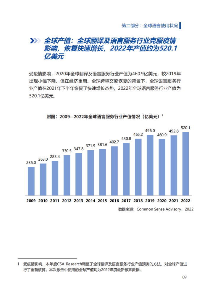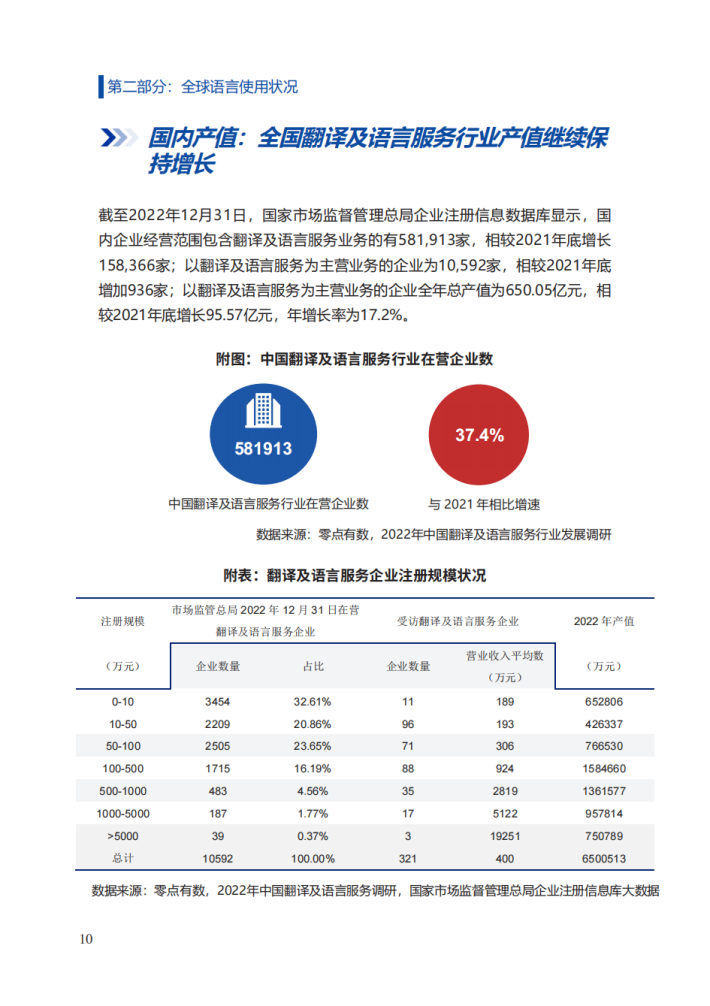 翻译及语言服务行业是高度国际化、专业化的服务性行业。为全面深入了解我国翻译及语言服务行业状况,推动行业高质量发展,中国翻译协会自2012年起开展中国翻译及语言服务行业双年调查,对翻译及语言服务行业的现状、特征、问题、趋势等因素进行系统调研和深入分析。自2019年起,双年调查改为年度调查。按照年度报告惯例,本年度报告为《2023中国翻译及语言服务行业发展报告》。报告中引用的调查数据、统计数据、大数据截至2022年12月31日。