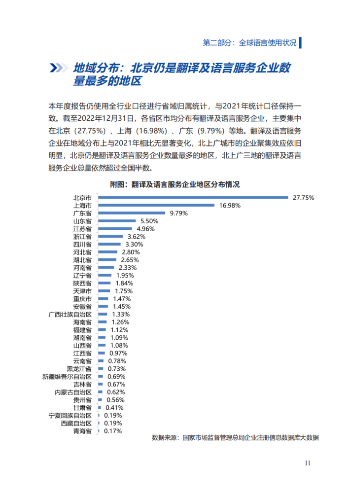 本报告由中国翻译协会组织调查研究,委托北京零点有数数据科技股份有限公司进行数据采集工作。本报告总体数据来源于国家市场监督管理总局企业注册信息数据库大数据、中国高等教育学生信息网大数据、全国翻译专业资格考试基础数据统计分析系统、国家公务员局官网大数据、中央公务员招录大数据及项目组调研所得。本项研究调查部分,采取定向邀约与定量调查的方式,范围覆盖全国各地。定量调查主要围绕四个类别受访对象(翻译及语言服务企业、翻译及语言服务需求方、语言服务人才培养方、语言服务自由从业者)展开,共收集问卷933份。受访对象及样本量分别为:翻译及语言服务企业321份、翻译及语言服务需求方300份、语言服务人才培养方212份以及语言服务自由从业者100份。