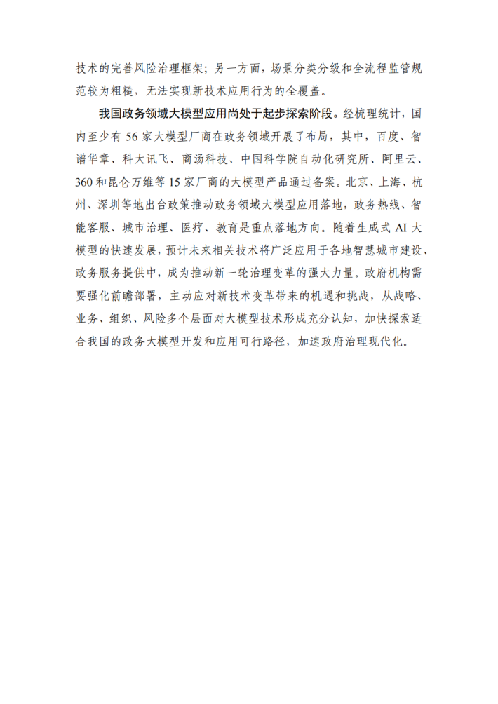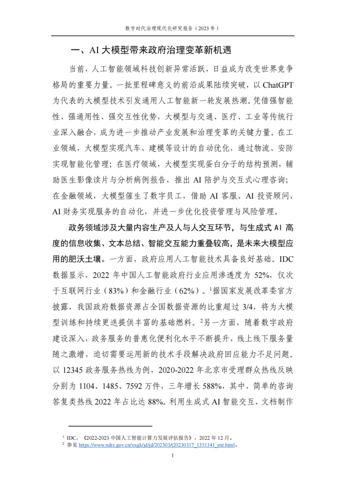 当前,生成式人工智能大模型成为各行各业关注重点和热议话题。以ChatGPT、Bard为代表的大模型是人工智能技术的一次飞跃,代表着AI技术从感知世界、理解世界向创造世界的跃迁。政务领域涉及大量内容生产及人与人交互环节,与生成式AI大模型高度的信息收集、文本总结、智能交互能力契合度较高,是未来生成式AI大模型应用的肥沃土壤。