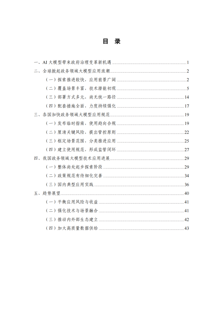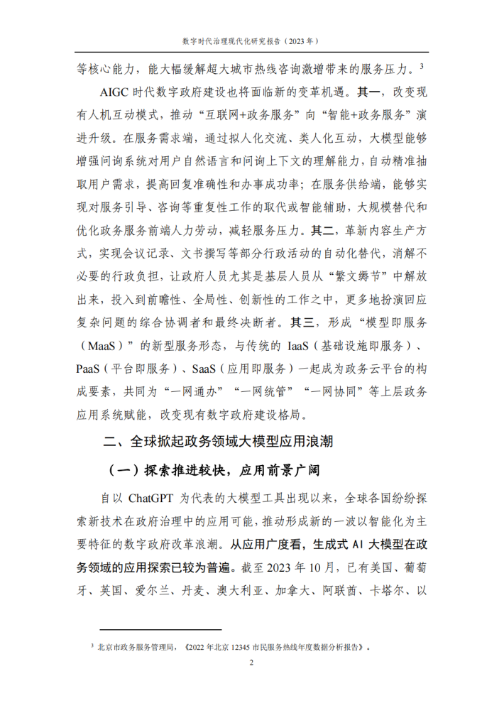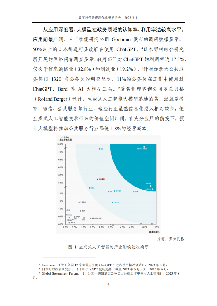 自大模型工具出现以来,全球各国纷纷探索新技术在政府治理中的应用可能,推动形成一波以智能化为主要特征的数字政府改革浪潮。从应用广度看,大模型在政务领域的应用探索已较为普遍,包括美国、英国、澳大利亚、加拿大、新加坡、日本、韩国在内的18个国家或地区已将大模型应用在政府事务管理中,场景覆盖政府内部办公、政务信息公开、政务服务提供、民生服务优化和国防航天等5大领域13个细分场景。从应用深度看,部分国家在政务领域的大模型认知率、利用率达到较高水平,罗兰贝格咨询公司预计,在充分应用的前提下,预计大模型将推动公共服务行业降低1.8%的经营成本。从部署推进看,新加坡、日本、美国等实践较为靠前,已推动地方分散探索向集成应用转变,在部署方式、数据处理等方面做出统筹安排。