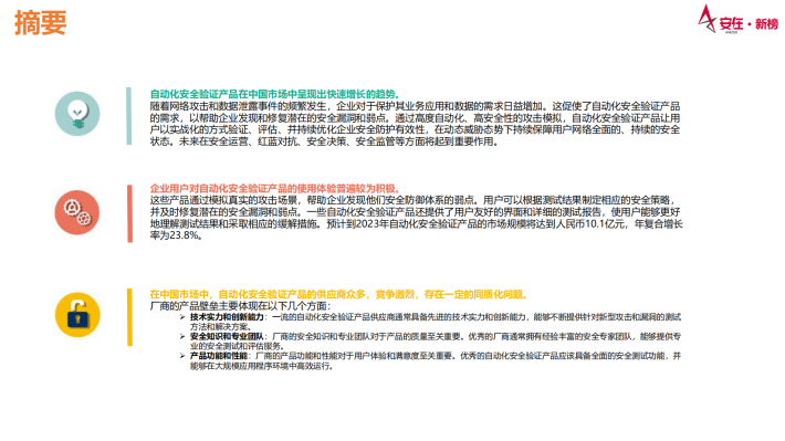 这些产品通过模拟真实的攻击场景,帮助企业发现他们安全防御体系的弱点。用户可以根据测试结果制定相应的安全策略,并及时修复潜在的安全漏洞和弱点。一些自动化安全验证产品还提供了用户友好的界面和详细的测试报告,使用户能够更好地理解测试结果和采取相应的缓解措施。预计到2023年自动化安全验证产品的市场规模将达到人民币10.1亿元,年复合增长率为23.8%。