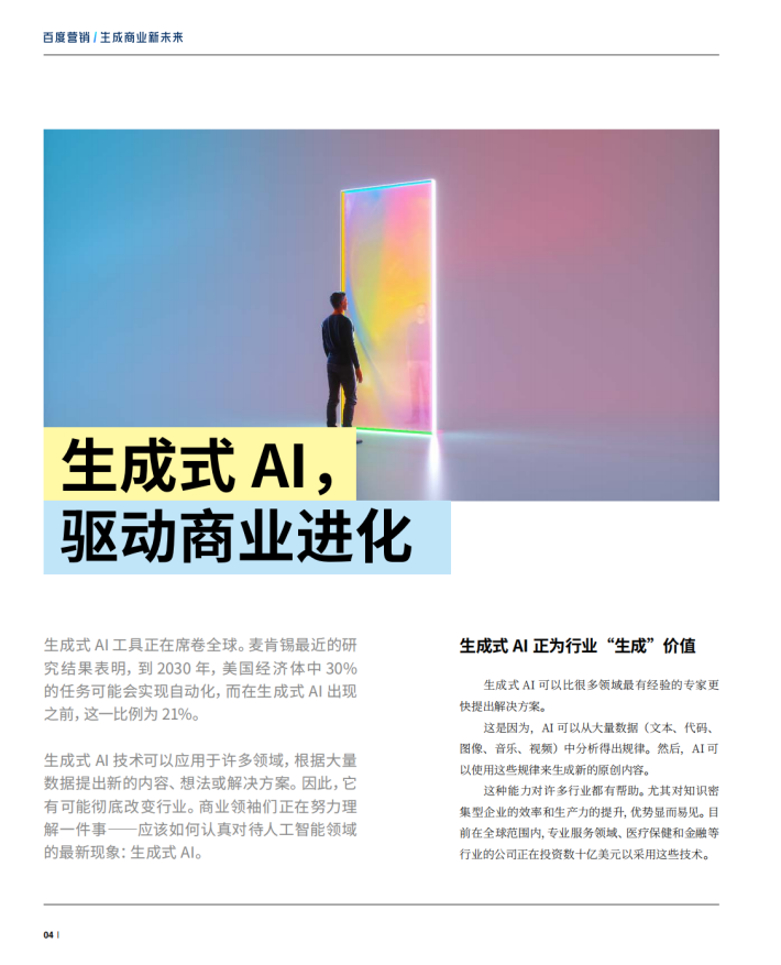 而在AI主导的商业世界中,生成式AI的崛起不仅是技术的进步,更是商业策略的演进。最近,埃森哲深刻探讨了以人为中心的技术发展,尤其是生成式人工智能在历经多年的指数级创新演进后,将如何提升人类能力、激发潜力,进而重塑商业模式。据埃森哲测算,生成式人工智能将影响各行业四成的工作时间,提高900种不同类型工作的产出效率,并在全球范围内创造至少8万亿美元的经济价值。
