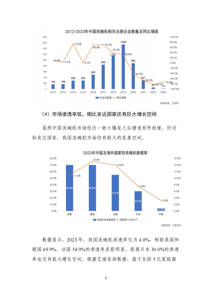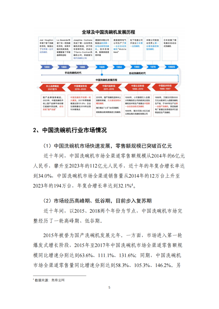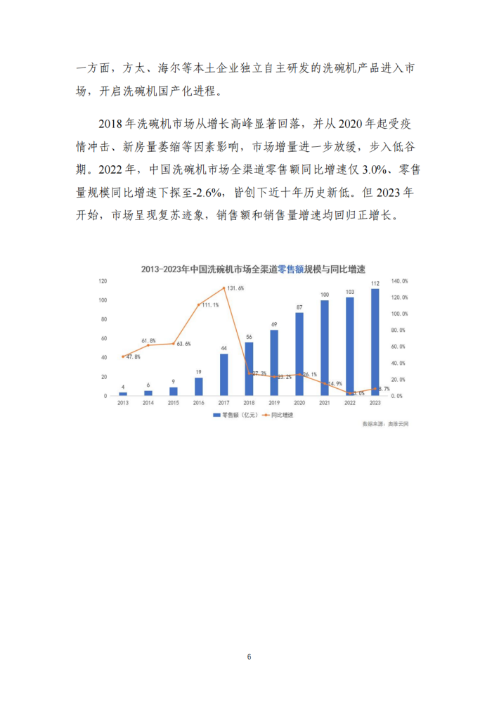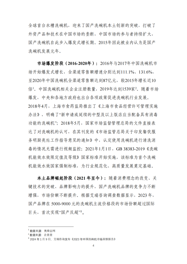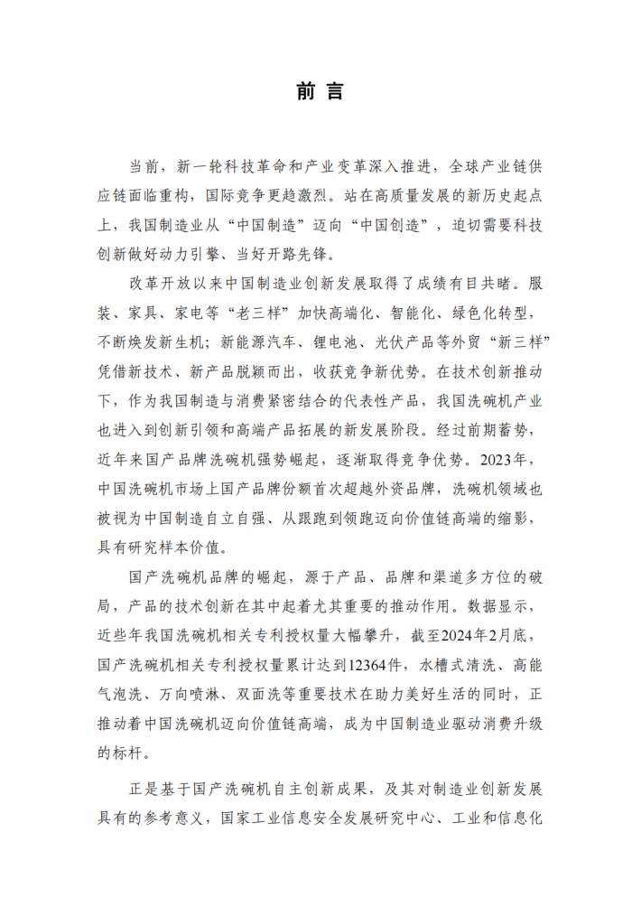 改革开放以来中国制造业创新发展取得了成绩有目共睹。服装、家具、家电等“老三样”加快高端化、智能化、绿色化转型,不断焕发新生机;新能源汽车、锂电池、光伏产品等外贸“新三样”凭借新技术、新产品脱颖而出,收获竞争新优势。在技术创新推动下,作为我国制造与消费紧密结合的代表性产品,我国洗碗机产业也进入到创新引领和高端产品拓展的新发展阶段。经过前期蓄势,近年来国产品牌洗碗机强势崛起,逐渐取得竞争优势。2023年,中国洗碗机市场上国产品牌份额首次超越外资品牌,洗碗机领域也被视为中国制造自立自强、从跟跑到领跑迈向价值链高端的缩影,具有研究样本价值。