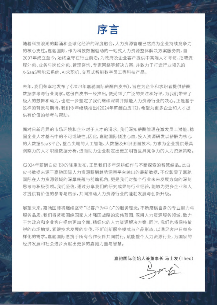 去年,我们荣幸地发布了《2023年嘉驰国际薪酬白皮书》,旨在为企业和求职者提供薪酬数据参考与行业洞察。这份白皮书一经推出,便受到了广泛的关注和好评,为我们带来了极大的鼓舞和动力,也进一步坚定了我们继续深耕并赋能人力资源行业的决心。正是基于这样的背景与期待,我们今年继续推出《2024年薪酬白皮书》,希望为更多企业和人才提供有价值的参考与帮助。