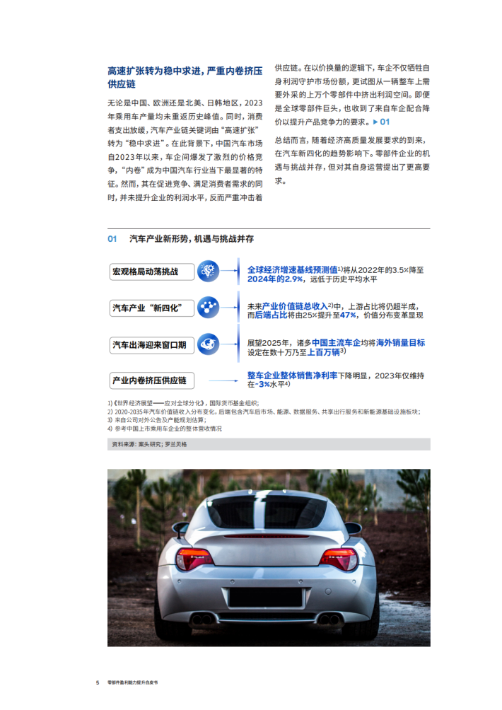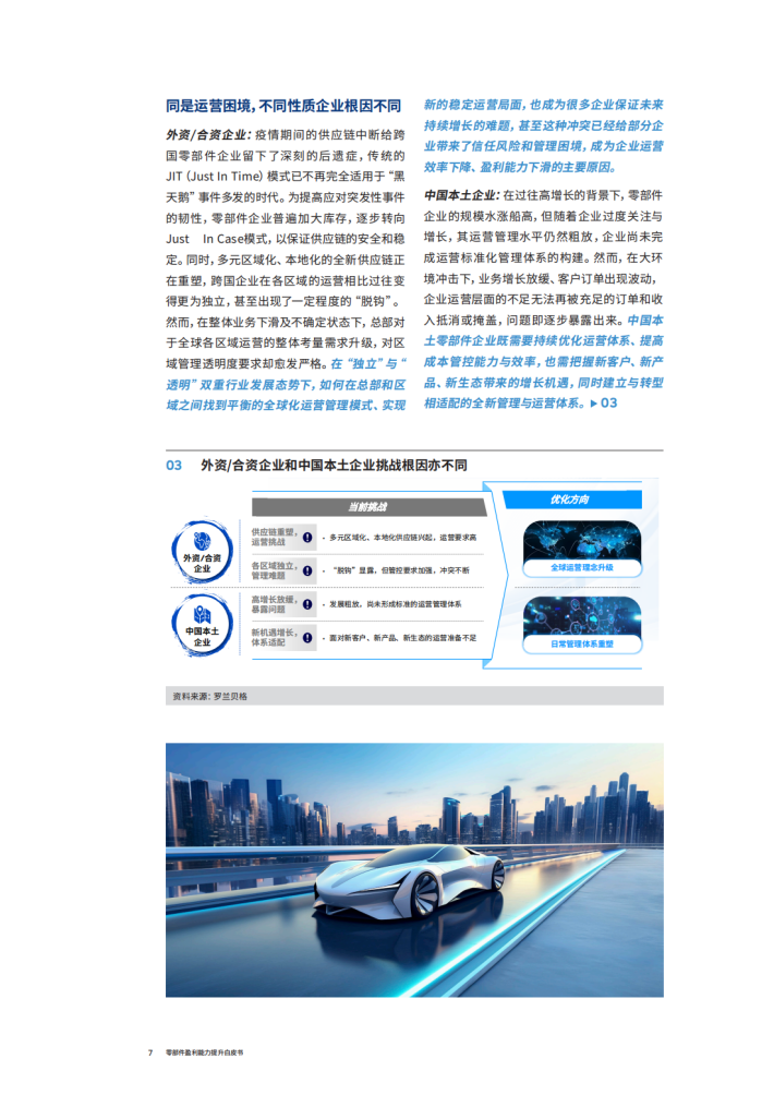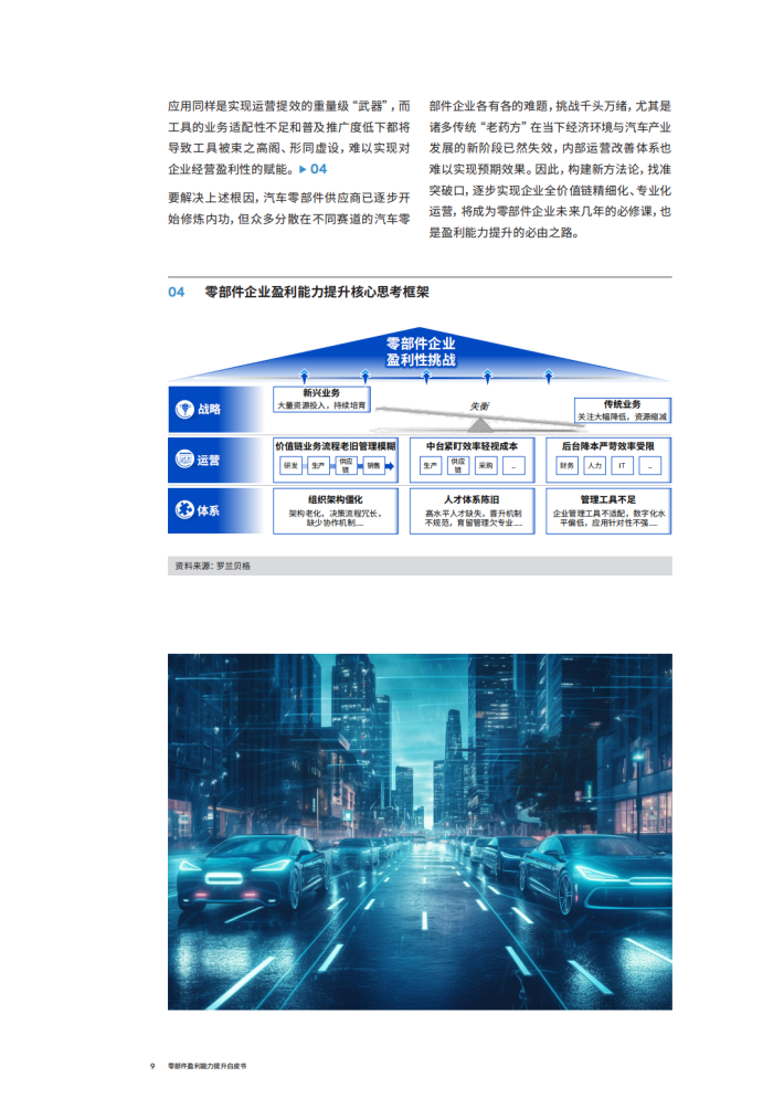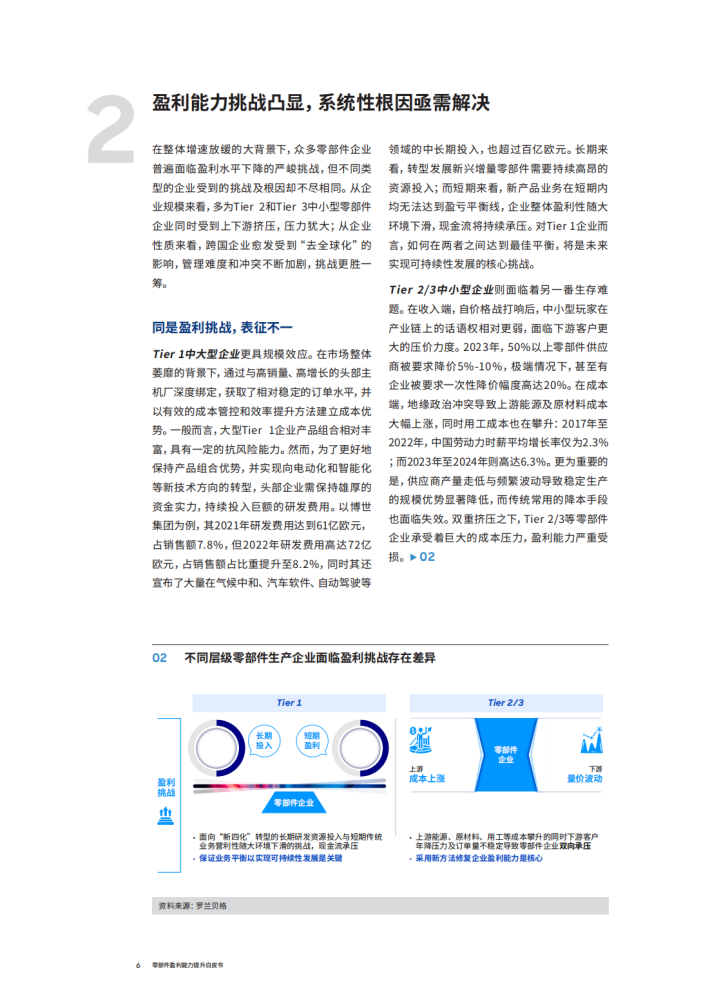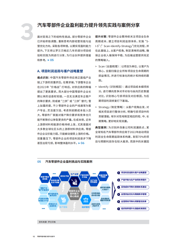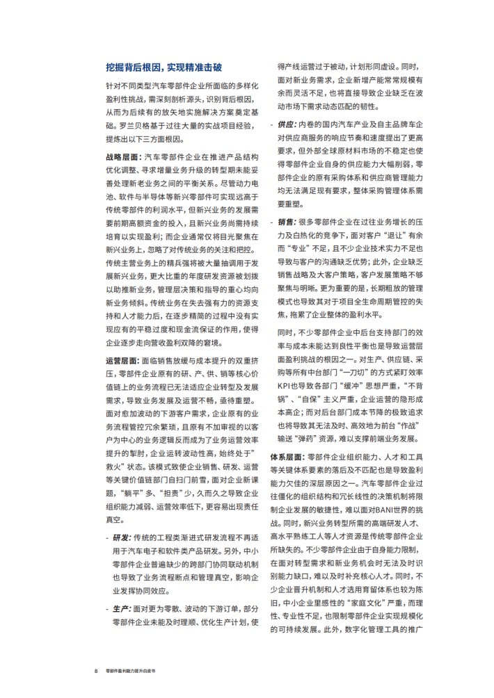 由此,本报告通过洞察不同类型零部件企业现有发展掣肘,基于罗兰贝格过往项目经验积累,针对现阶段汽车零部件行业普遍存在的盈利性问题,向行业玩家提供驾驭现有挑战、识别潜在机会的解决思路,并分享相关实践案例,为企业实现盈利能力提升保驾护航。
