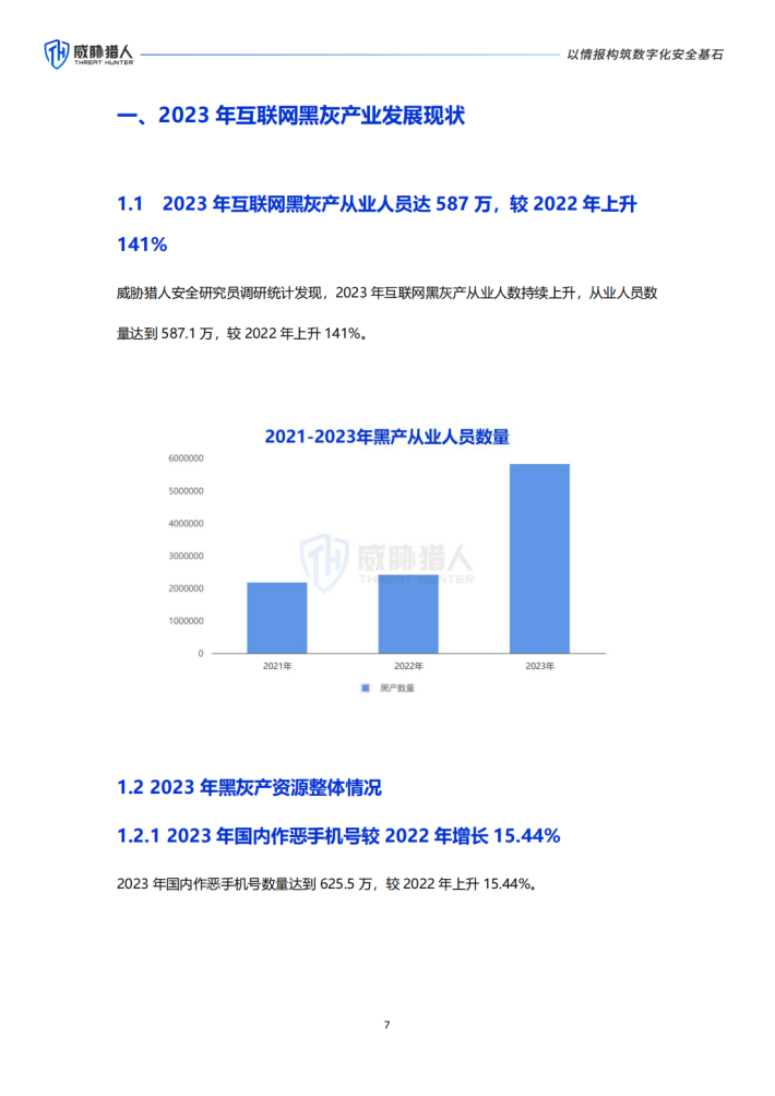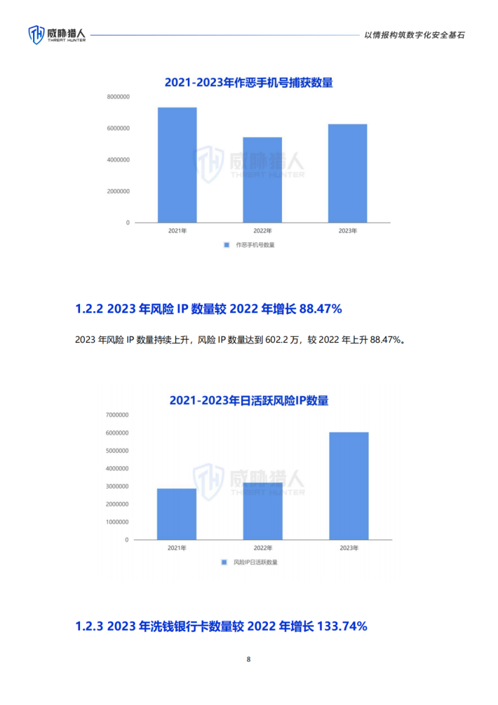 2023年,黑灰产从业人员人数超过580万,威胁猎人捕获到的国内作恶手机号数量高达625万,日活跃风险IP数量602万,洗钱银行卡数量87万。