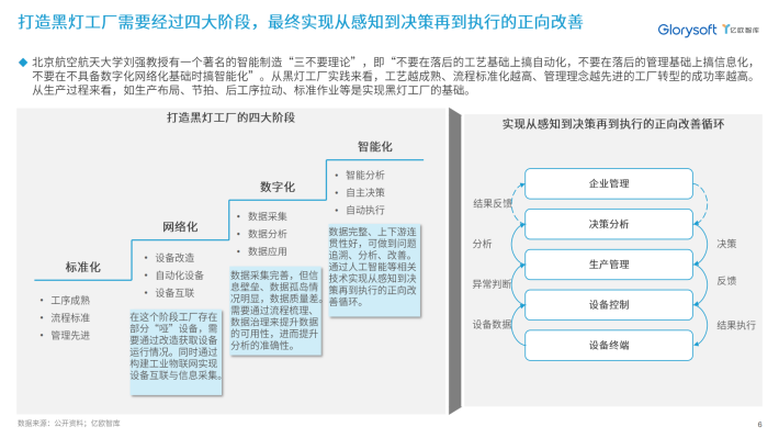 北京航空航天大学刘强教授有一个著名的智能制造“三不要理论”,即“不要在落后的工艺基础上搞自动化,不要在落后的管理基础上搞信息化,不要在不具备数字化网络化基础时搞智能化”。从黑灯工厂实践来看,工艺越成熟、流程标准化越高、管理理念越先进的工厂转型的成功率越高。从生产过程来看,如生产布局、节拍、后工序拉动、标准作业等是实现黑灯工厂的基础。