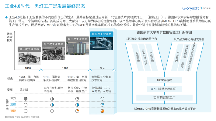 工业4.0是基于工业发展的不同阶段作出的划分,最终目标是通过应用新一代信息技术实现黑灯工厂(智能工厂)。德国萨尔大学希尔教授曾对智能工厂做过一个清晰的描述,其构成分为三大部分:以订单为核心的运营平台、以产品为中心的研发平台以及以MES、CPS赛博物理系统为核心的生产管控平台。而后两者,MES与以设备为中心的CPS是数字化车间的核心信息化系统,是企业进行智能制造建设的基础与关键。